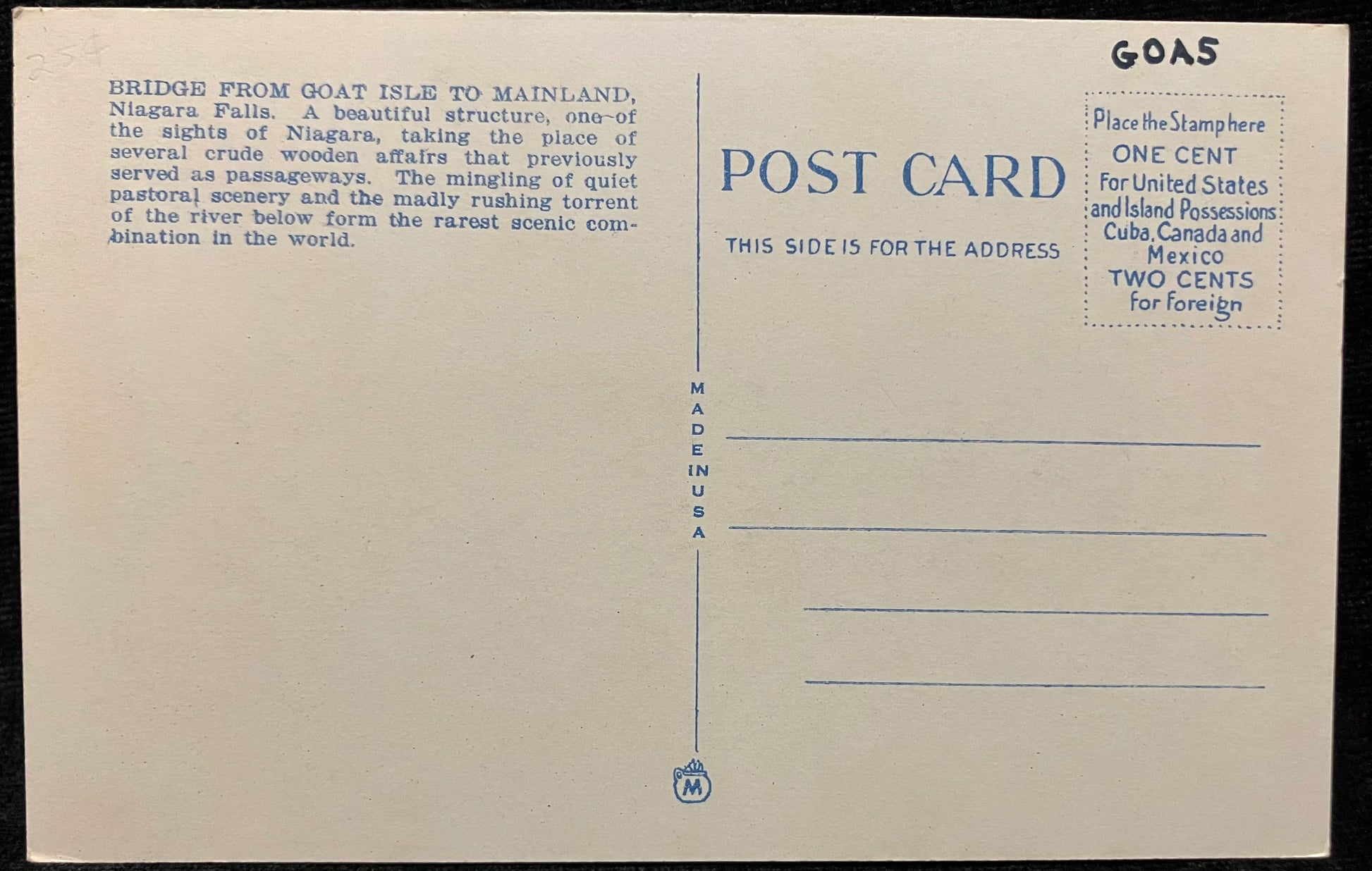 On front: Bridge From Goat Isle to Mainland, Niagara Falls.