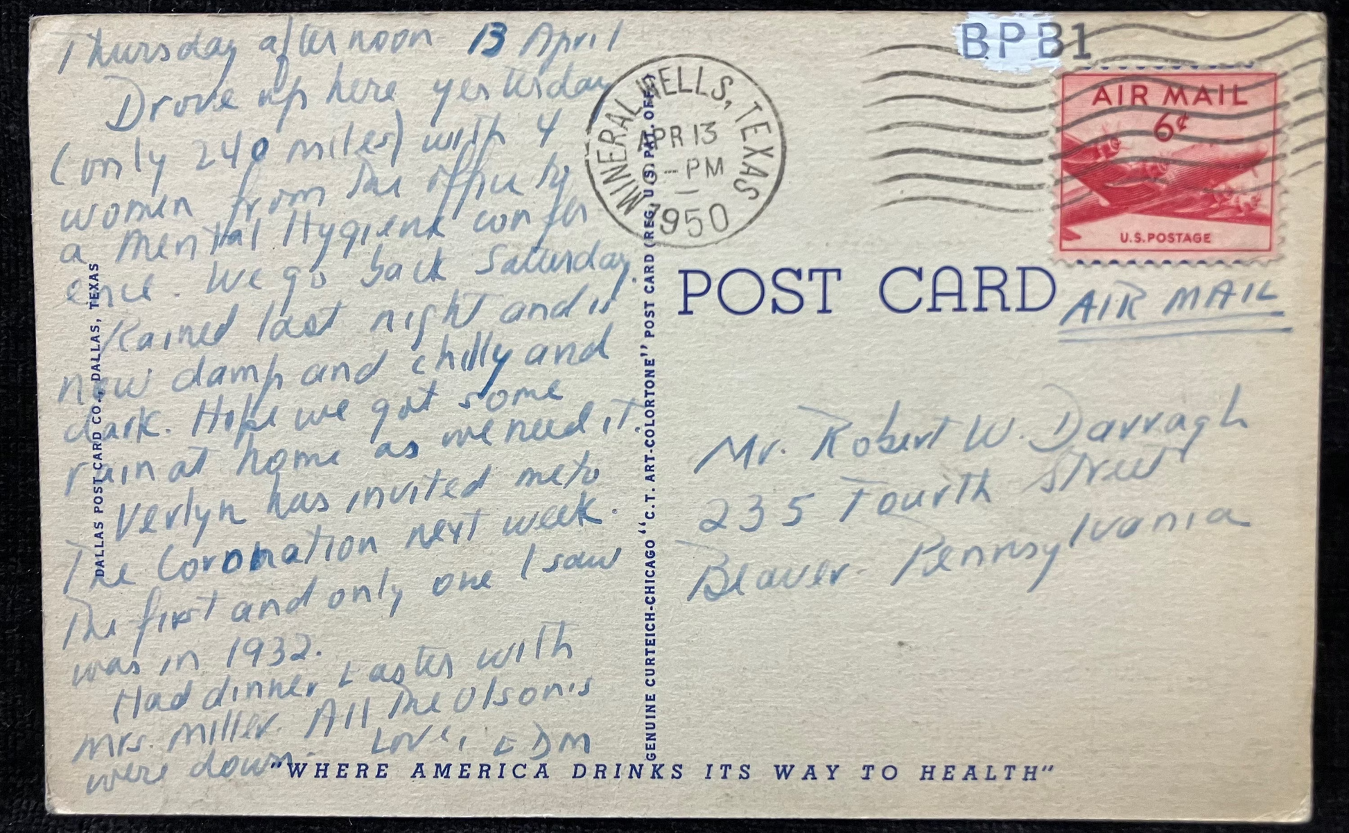 Mailed: Postmark: 1950 Mineral Wells, Texas, Red six-cent Air Mail stamp