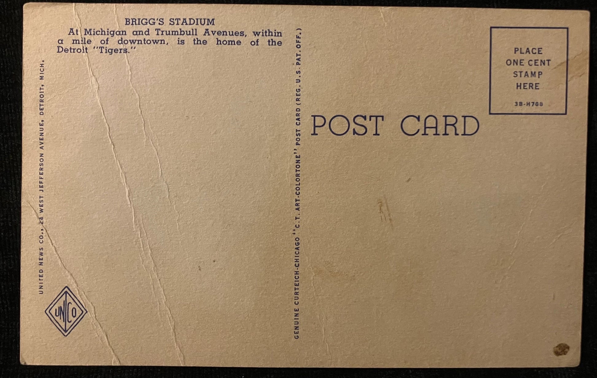 On back: Briggs Stadium at Michigan and Trumbull Avenues, within a mile of downtown, is the home of the Detroit “Tigers.”