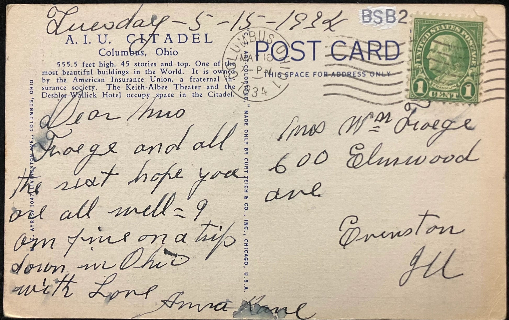 Back: A.I.U. Citadel, Columbus, Ohio. 555.5 feet high, 45 stories and top. One of the most beautiful buildings in the world. It is owned by the American Insurance Union, a fraternal insurance society. The Keith-Albee Theater and the Deshler-Wallick Hotel occupy space in the Citadel.