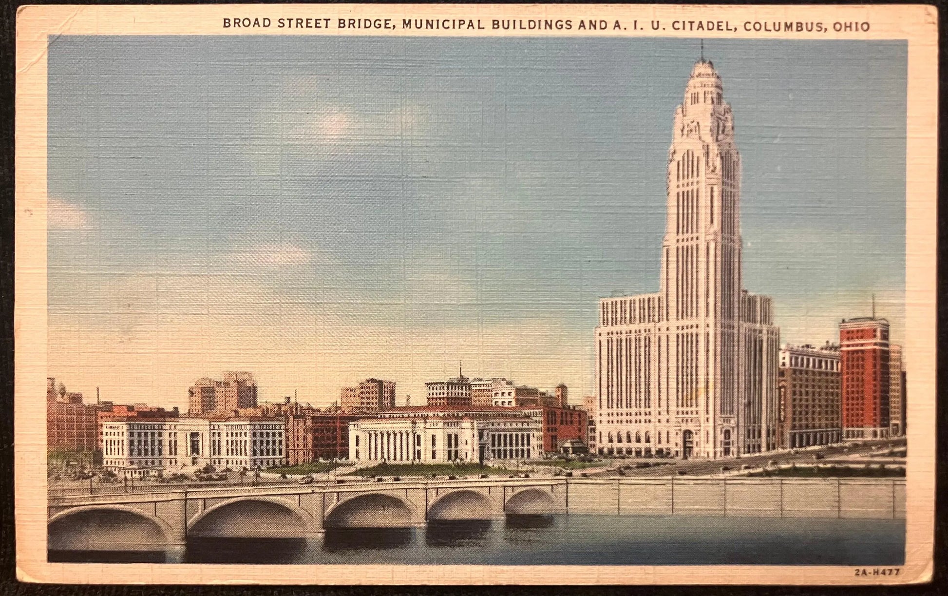 Front: Broad Street Bridge, Municipal Buildings, and A.I.U. Citadel, Columbus, Ohio