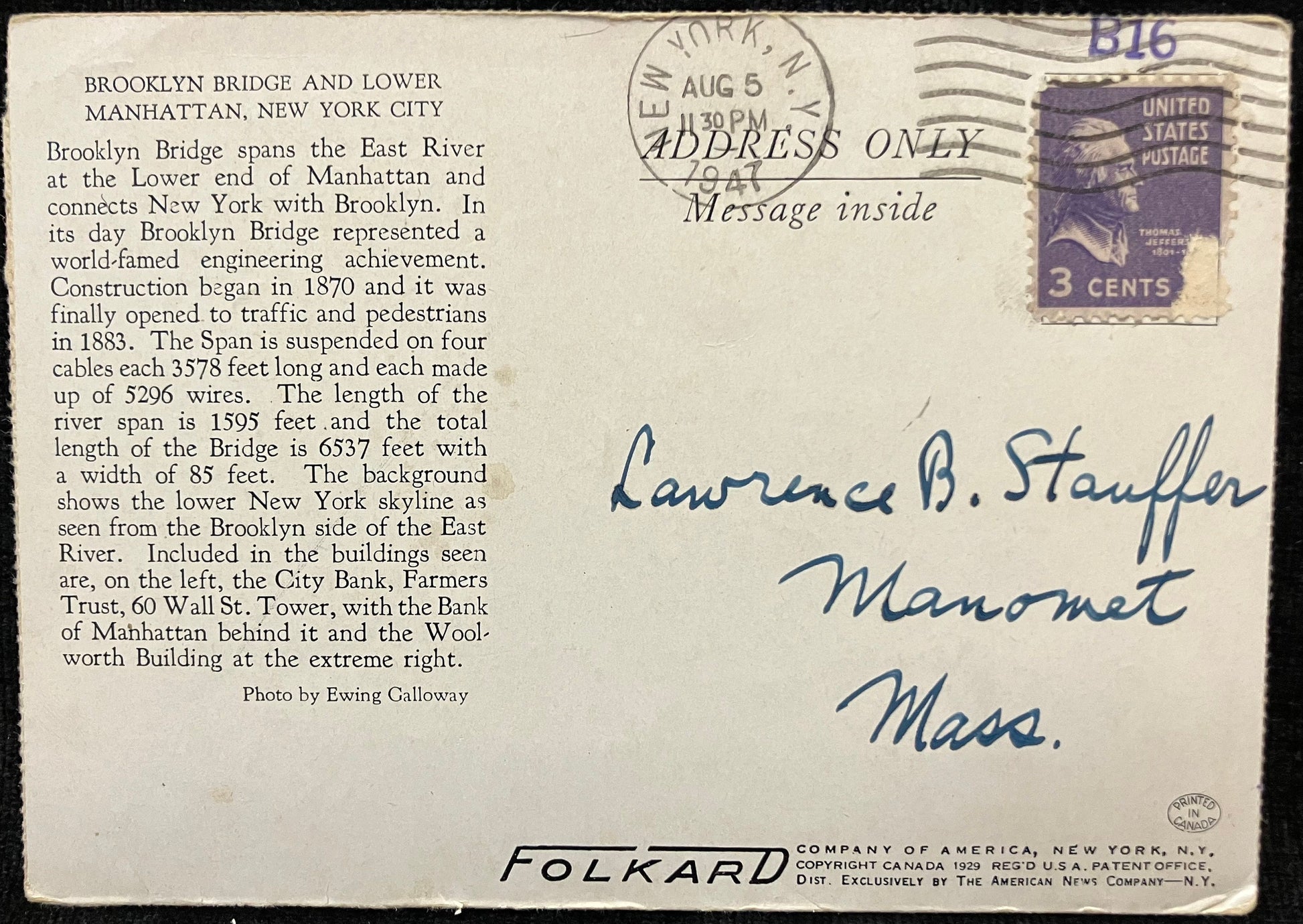 Mailed: Postmark in Aug of 1947 from New York, N. Y. with the three cent purple Thomas Jefferson stamp
