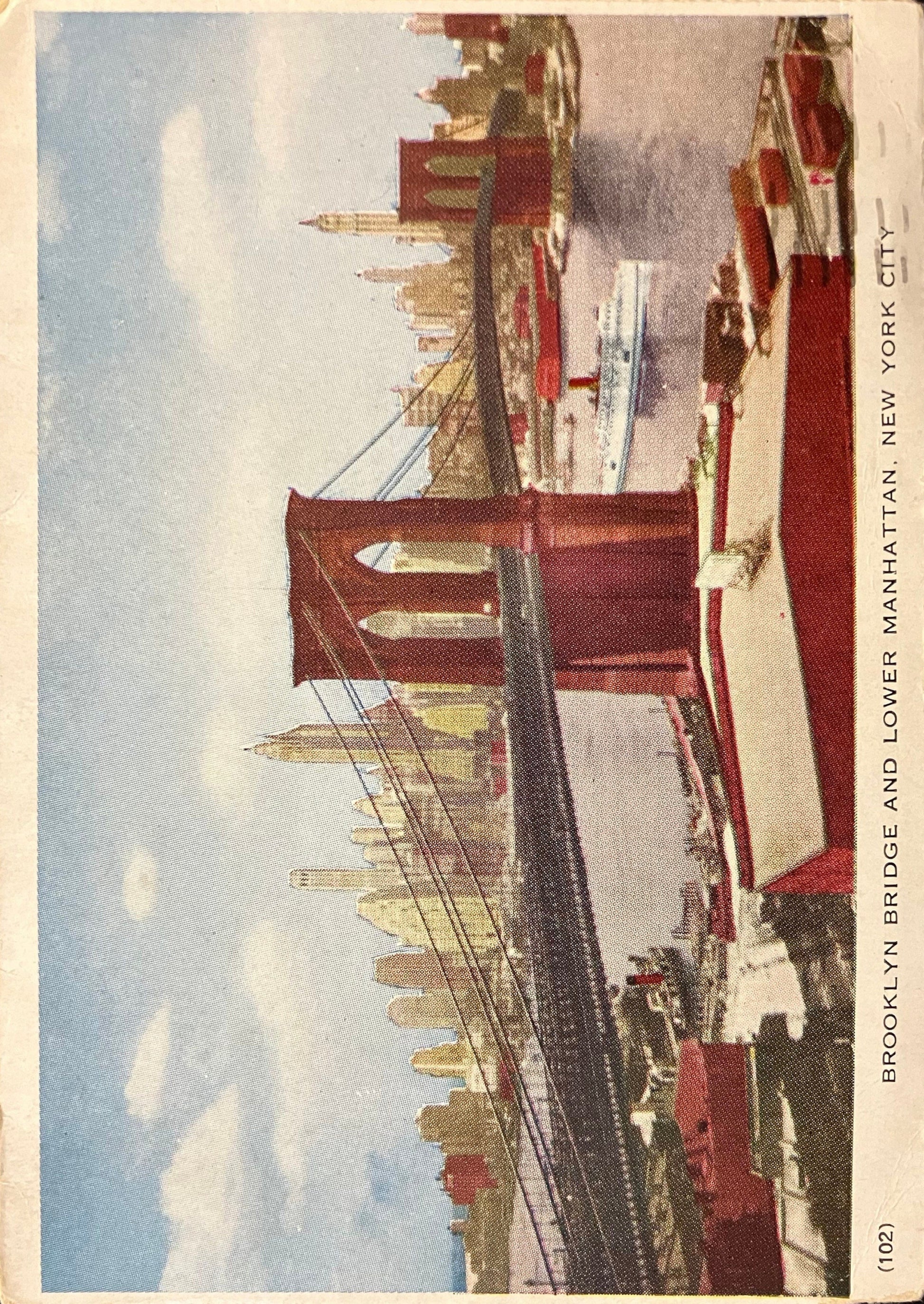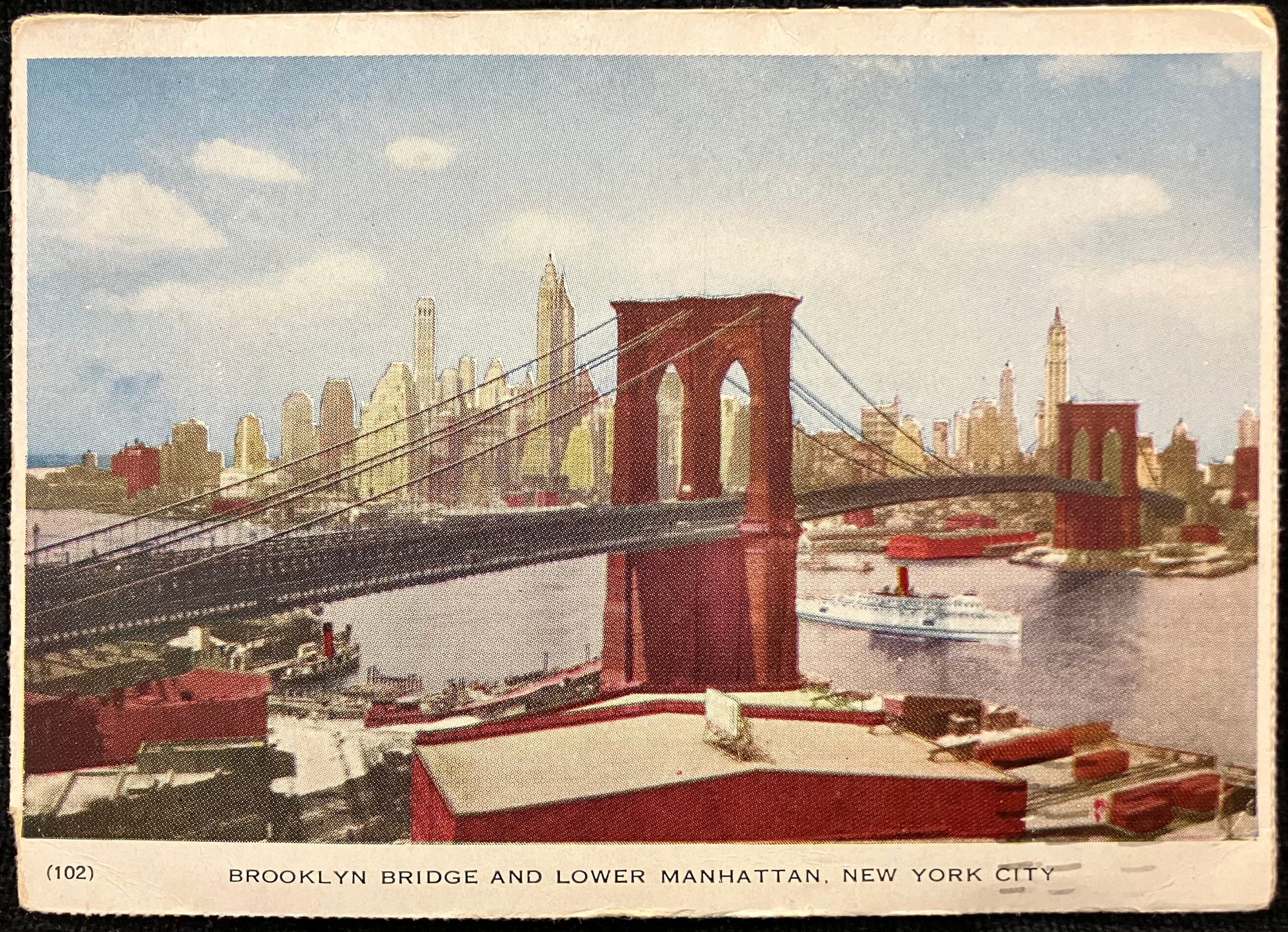 Back: Brooklyn Bridge and Lower Manhattan, New York City Brooklyn Bridge spans the East RIver at the Lower end of Manhattan and connects New York with Brooklyn. In its day Brooklyn Bridge represented a world-famed engineering achievement. Construction began in 1870 and it was finally opened to traffic and pedestrians in 1883. The Span is suspended on four cables each 3578 feet long and each made up 5296 wires. The length of the river span is 1595 feet and the total length of the Bridge is 6537 feet with a width of 85 feet. The background shows the lower New York skyline as seen from the Brooklyn side of the East River. Included in the buildings seen are, on the left, the City Bank, Farmers Trust, 60 Wall ST. Tower, with the Bank of Manhattan behind it and the Woolworth Building at the extreme right.