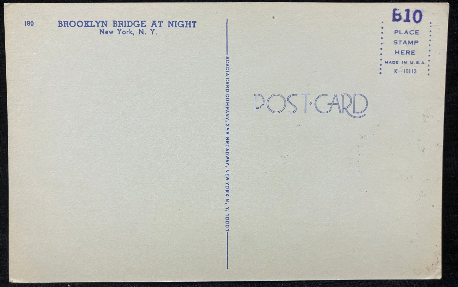 Back: Brooklyn Bridge at Night New York, N. Y.