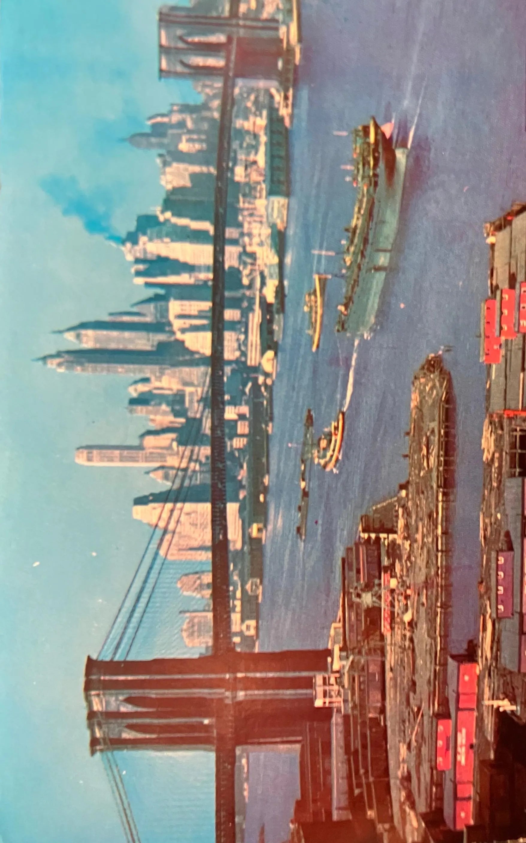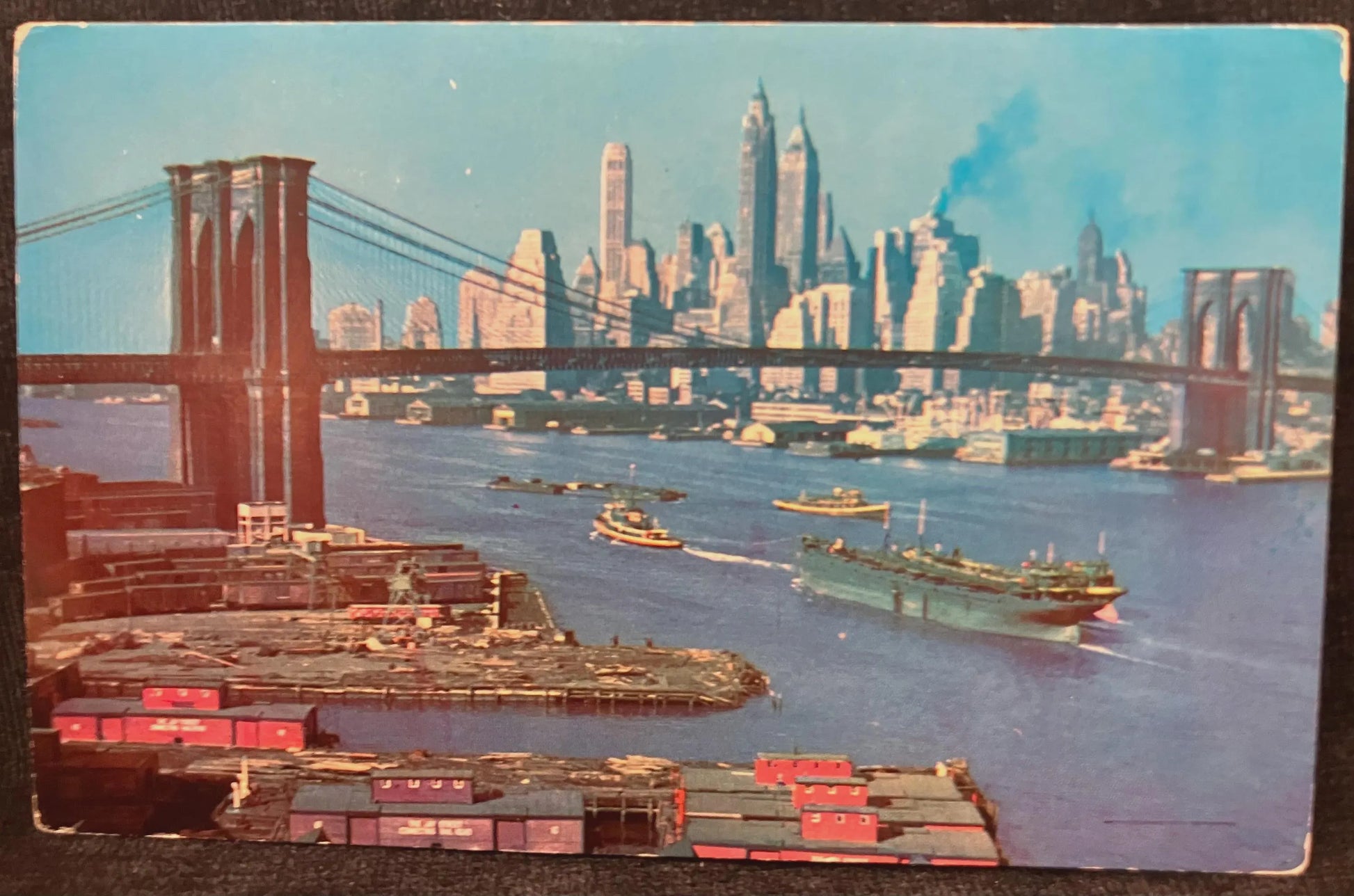 Brooklyn Bridge, East River and Lower Manhattan Skylin1e in 1970s- New York - Vintage Brooklyn Bridge Postcard - Shipping on the East River