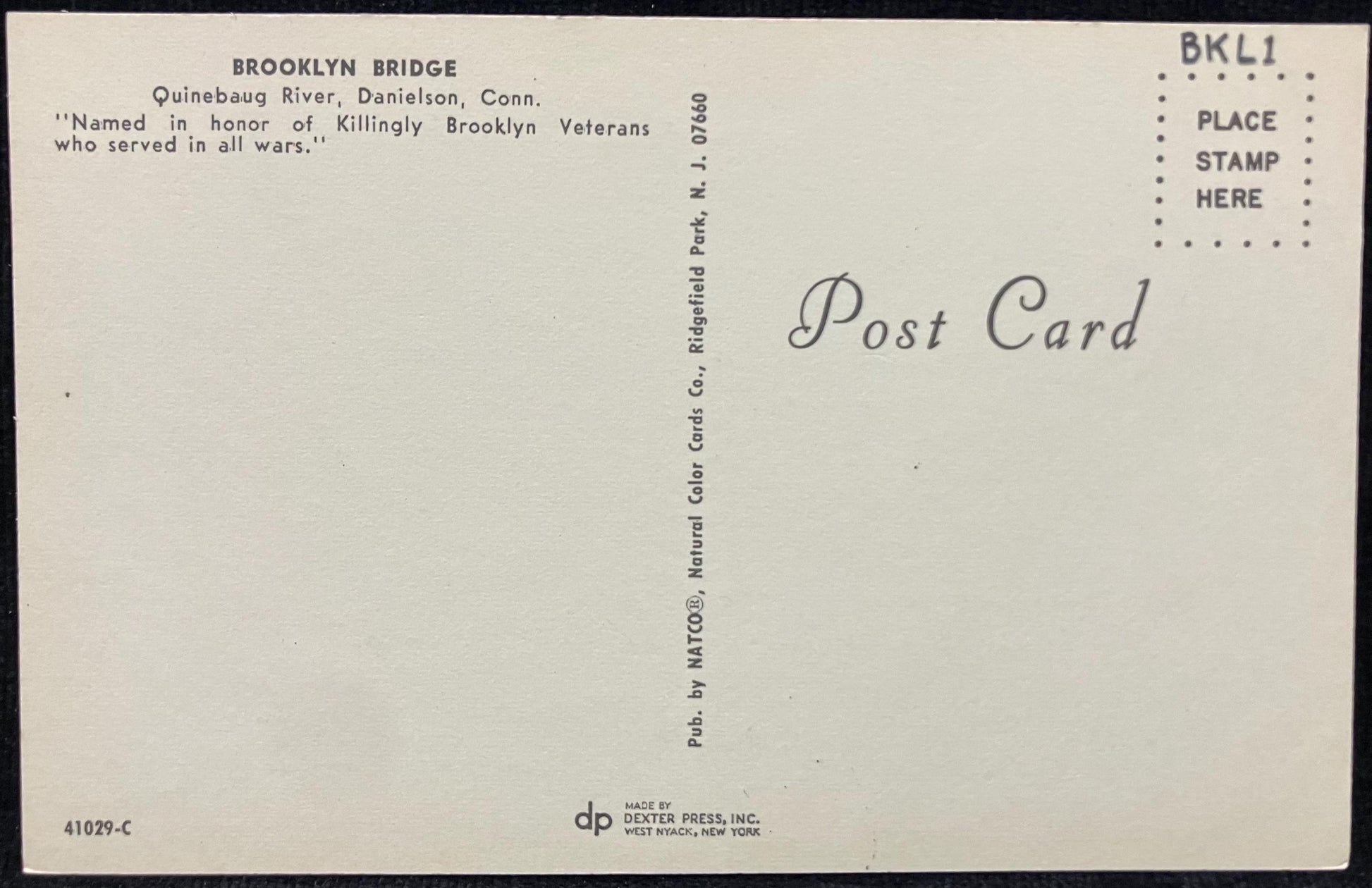 Back: BROOKLYN BRIDGE Quinebaug River, Danielson, Conn. "Named in honor of Killingly Brooklyn Veterans who served infall wars."