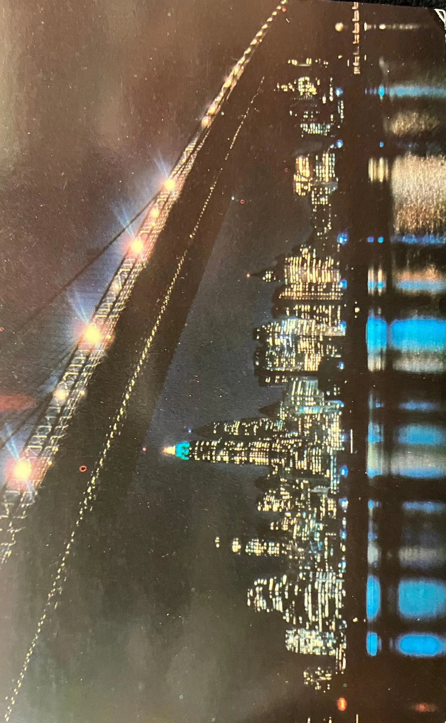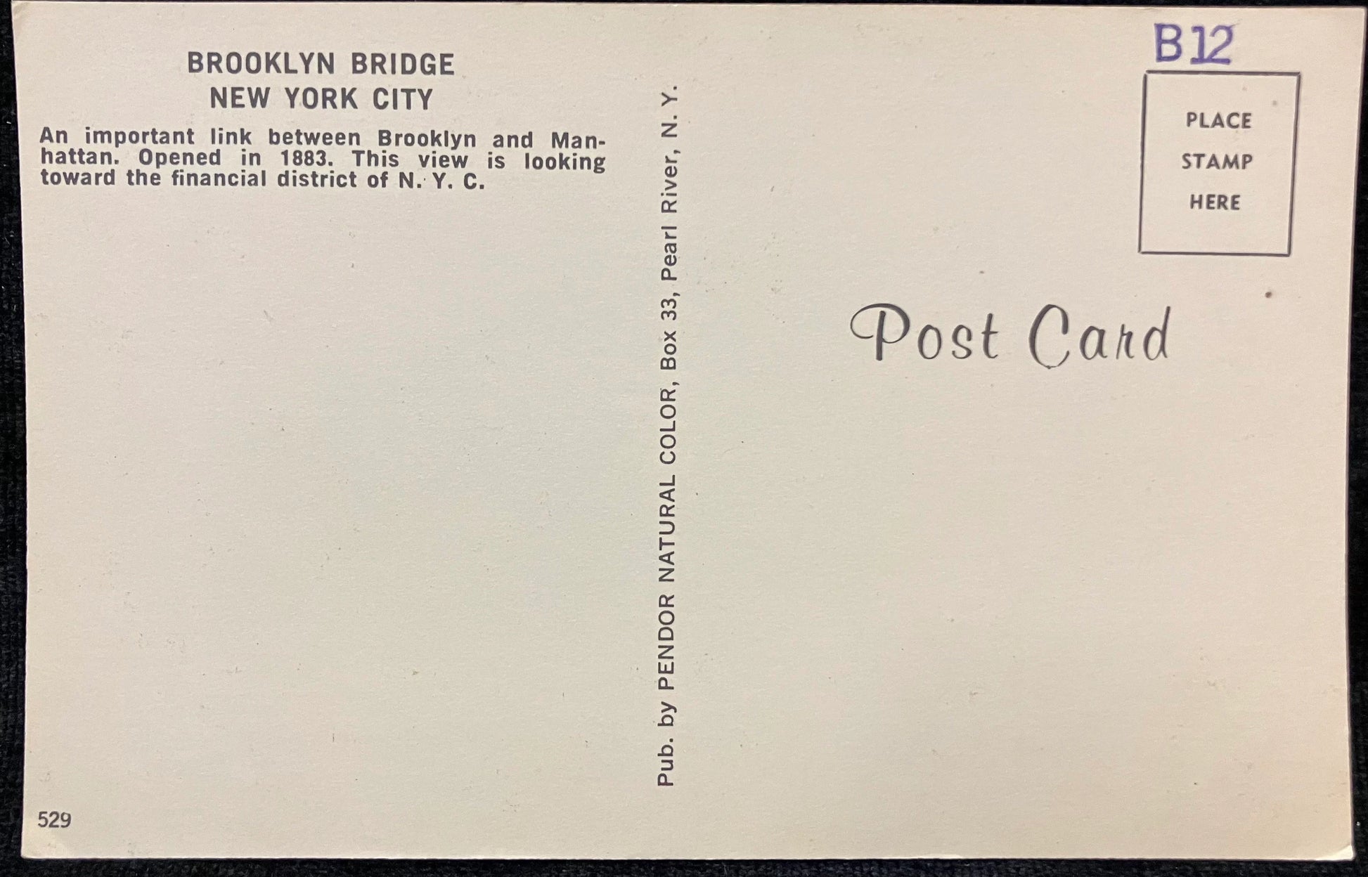 Back: Brooklyn Bridge New York City An important link between Brooklyn and Manhattan. Opened in 1883. This view is looking toward the financial district of N. Y. C.