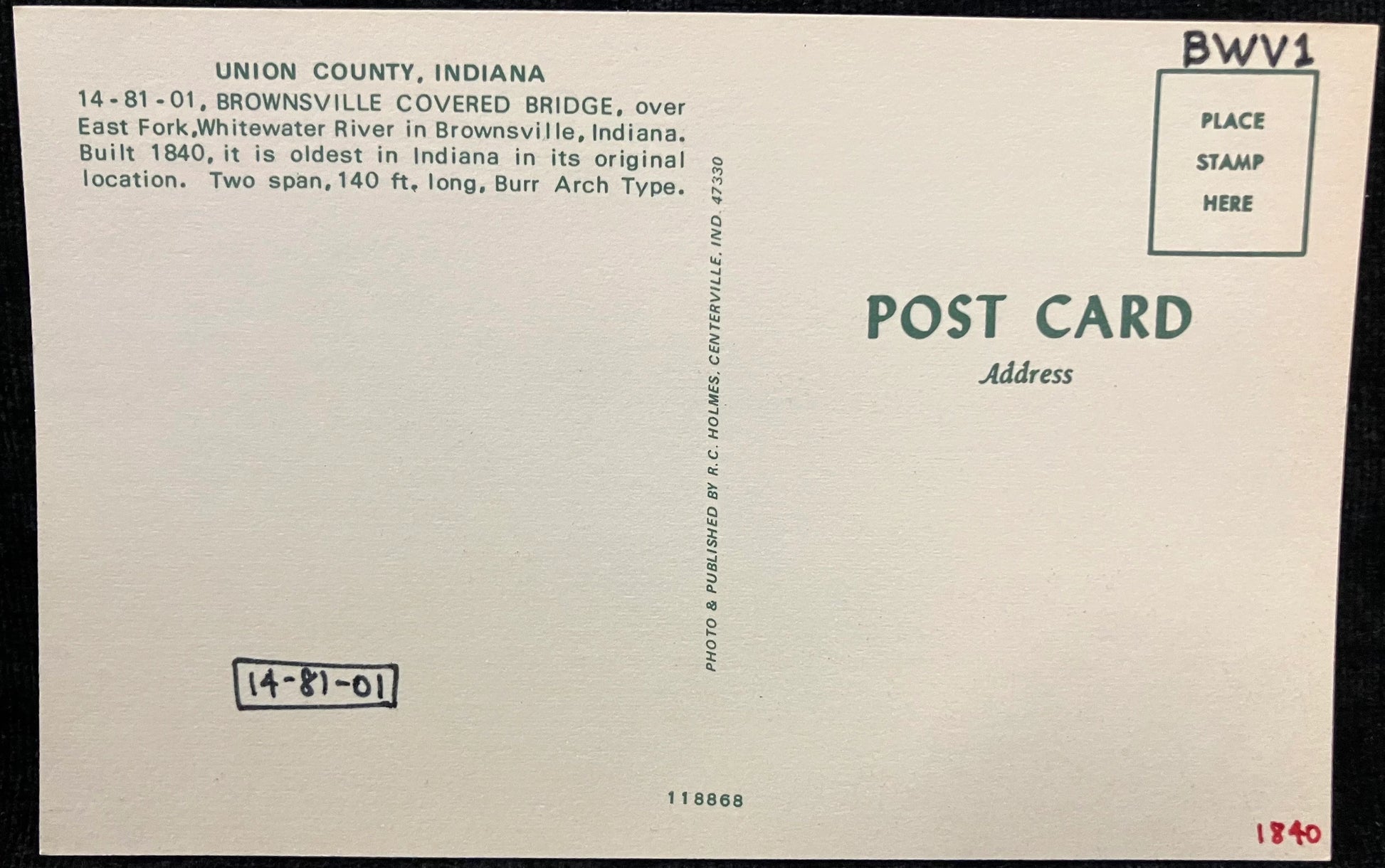 Back: UNION COUNTY, INDIANA 14-81-01, BROWNSVILLE COVERED BRIDGE, over East Fork, Whitewater River in Brownsville, Indiana. Built 1840, it is oldest in Indiana in its original location. Two span, 140 ft. long, BUrr Arch Type.