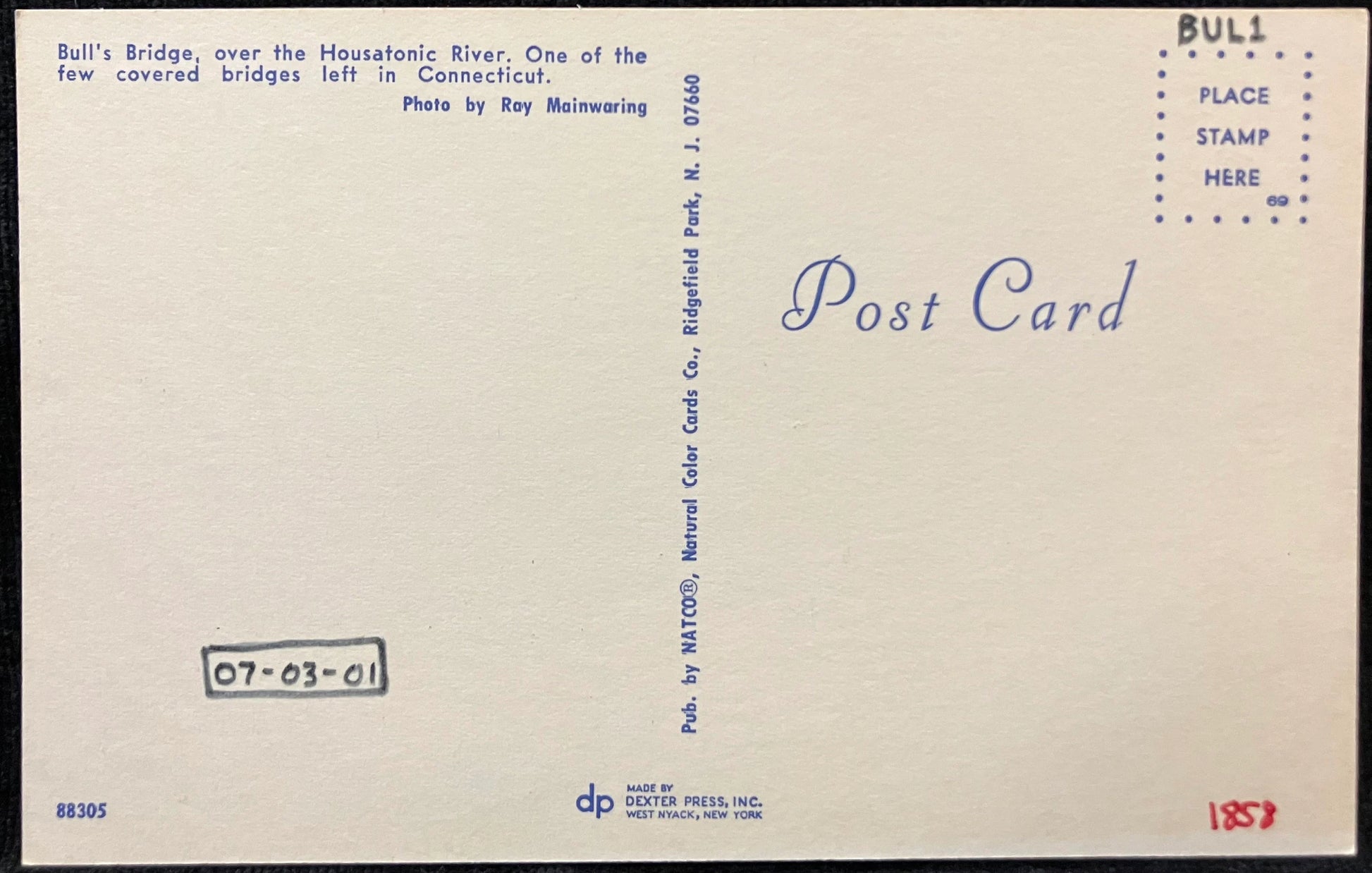 Back reads: Bull's Bridge over the Housatonic River. One of the few covered bridges left in Connecticut.