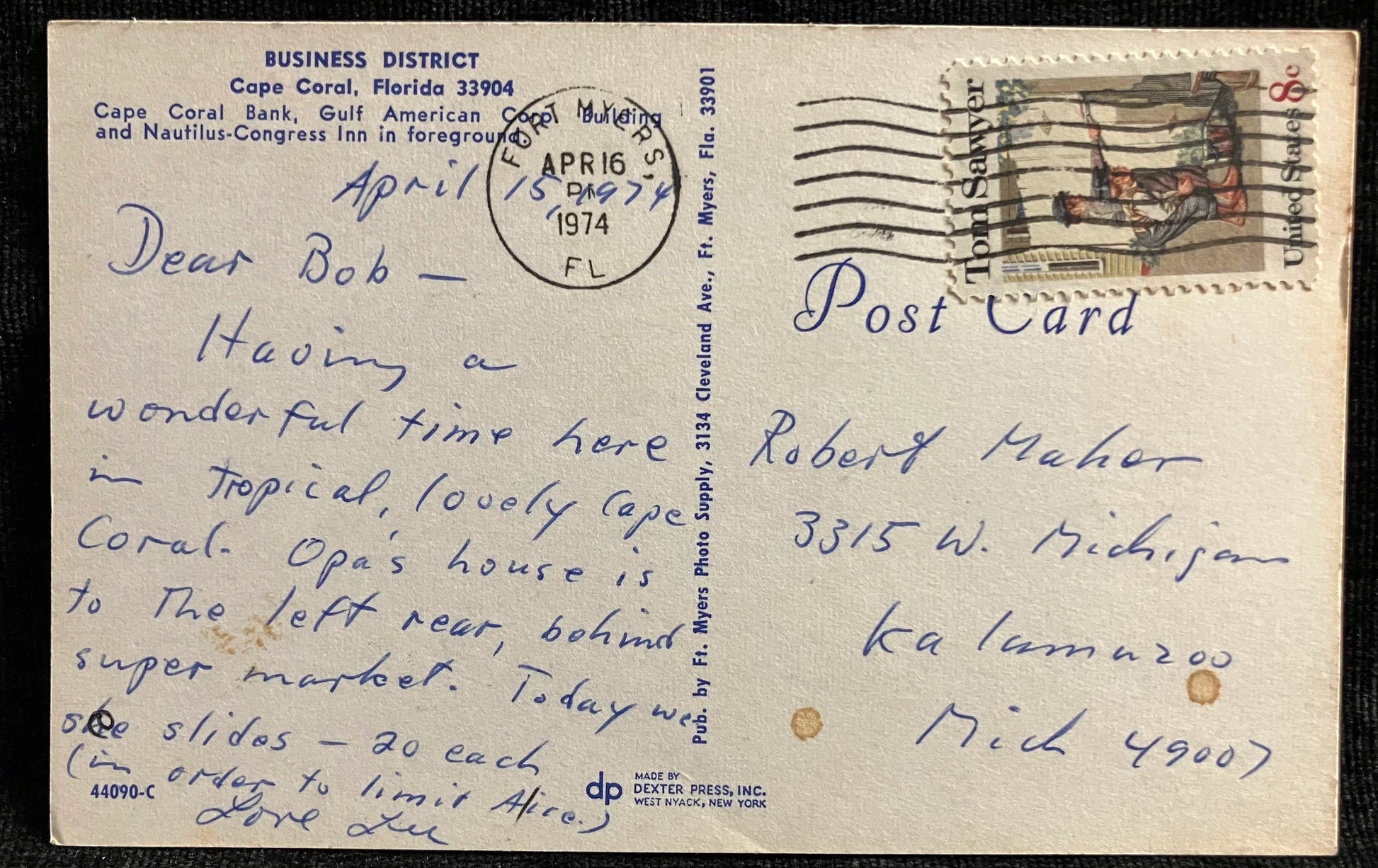Mailed: Postmark in in 1974 from Fort Myers, FL. with a full color eight cent Tom Sawyer stamp