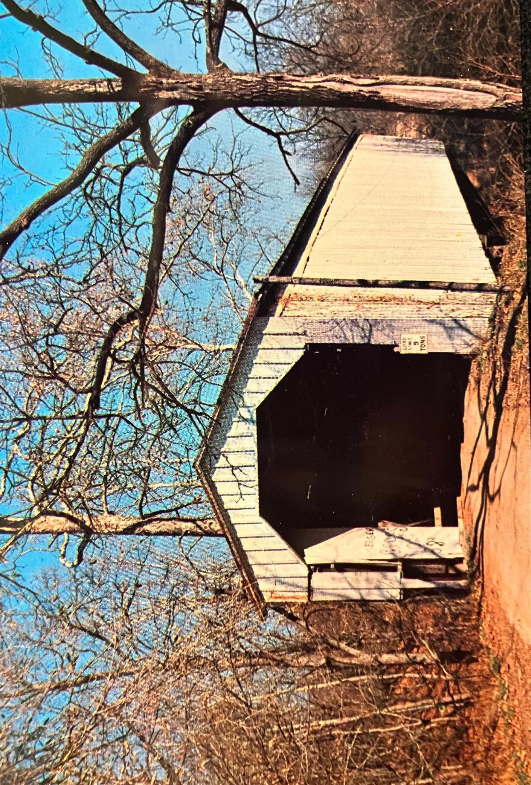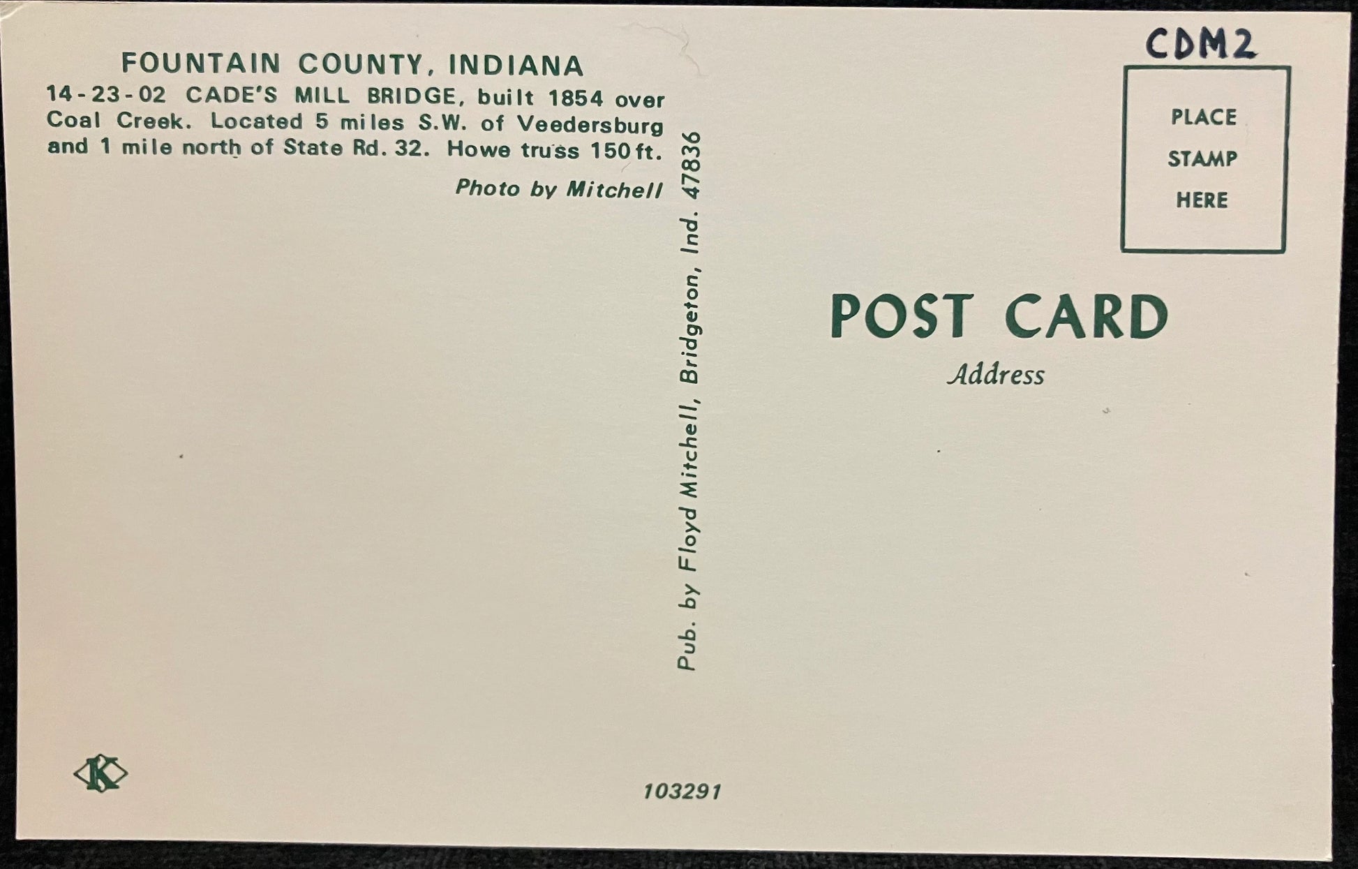 Back: FOUNTAIN COUNTY, INDIANA 14-23-02 CADE’S MILL BRIDGE, built 1854 over Coal Creek. Located 5 miles S. W. of Veedersburg and 1 miser north of State Rd. 32. Howe truss 150 ft.