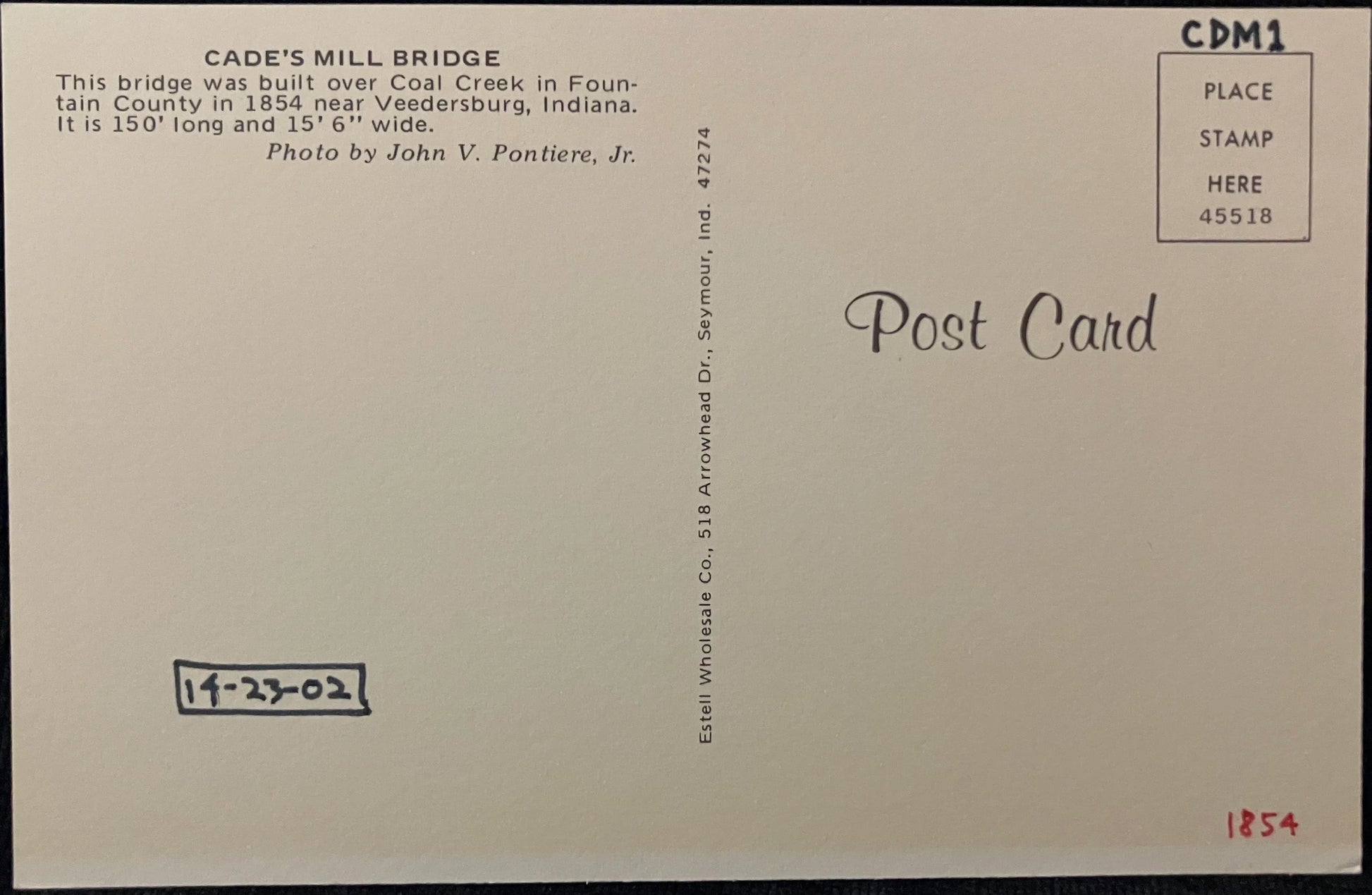 On back: CADE'S MILL BRIDGE This bridge was built over Coal Creek in Fountain county in 1854 near Veedersburg, Indiana. It is 150' long and 15' 6" wide.