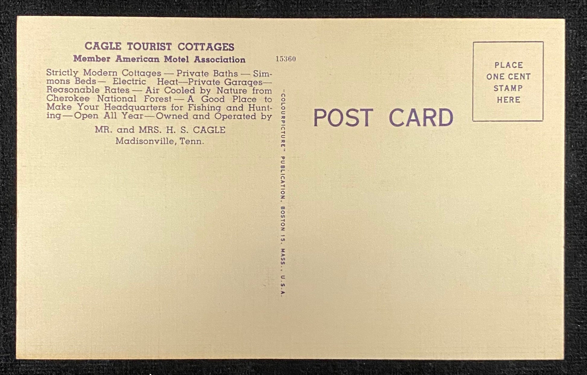 Back: "Cagle Tourist Cottages | Member American Motel Association | Strictly Modern Cottages - Private Baths - Simmons Beds - Electric Heat - Private Garages - Reasonable Rates - Air Cooled by Nature from Cherokee National Forest - A Good Place to Make Your Headquarters for Fishing and Hunting - Open All Year - Owned and Operated by Mr. and Mrs. H. S. Cagle. Madisonville, Tenn."