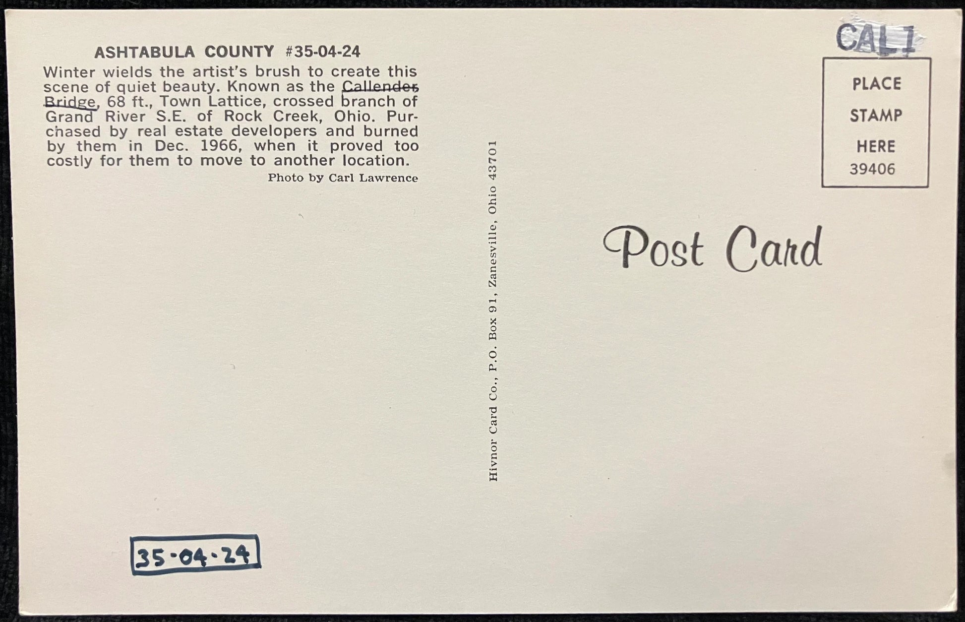 On back: ASHTABULA COUNTY #35-04-24 Winter wields the artist’s brush to create this scene of quiet beauty. Known as the Callender Bridge, 68 ft., Town Lattice, crossed branch of Grand River S.E. of Rock Creek, Ohio. Purchased by real estate developers and burned by them in Dec. 1966, when it proved too costly for them to move to another location.