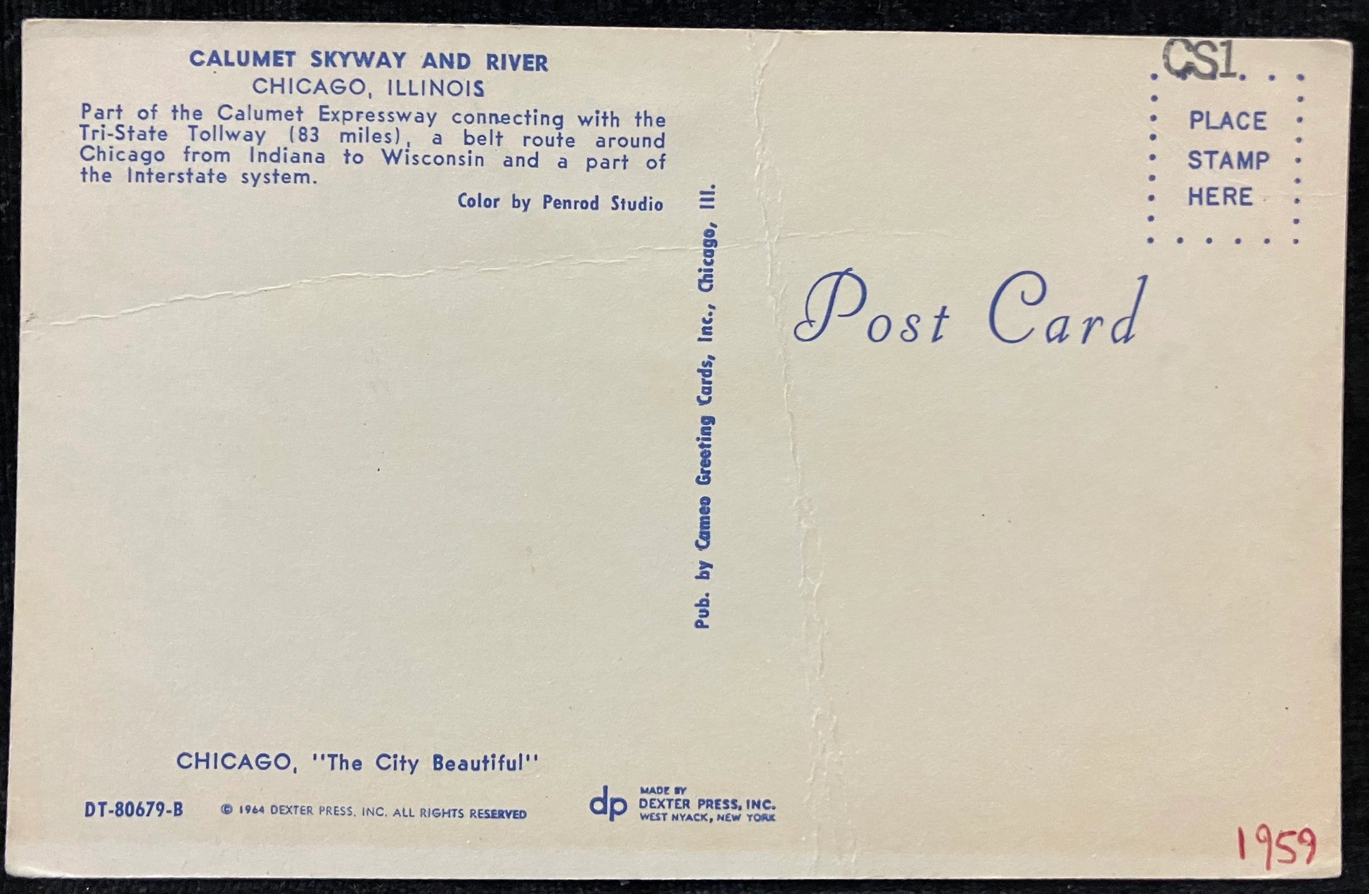 Back: Calumet Skyway and River, Chicago, Illinois. Part of the Calumet Expressway connects with the Tri-State Tollway (83 miles), a belt route around Chicago that forms a route from Indiana to Wisconsin, and is part of the Interstate System. Chicago, “The City Beautiful”