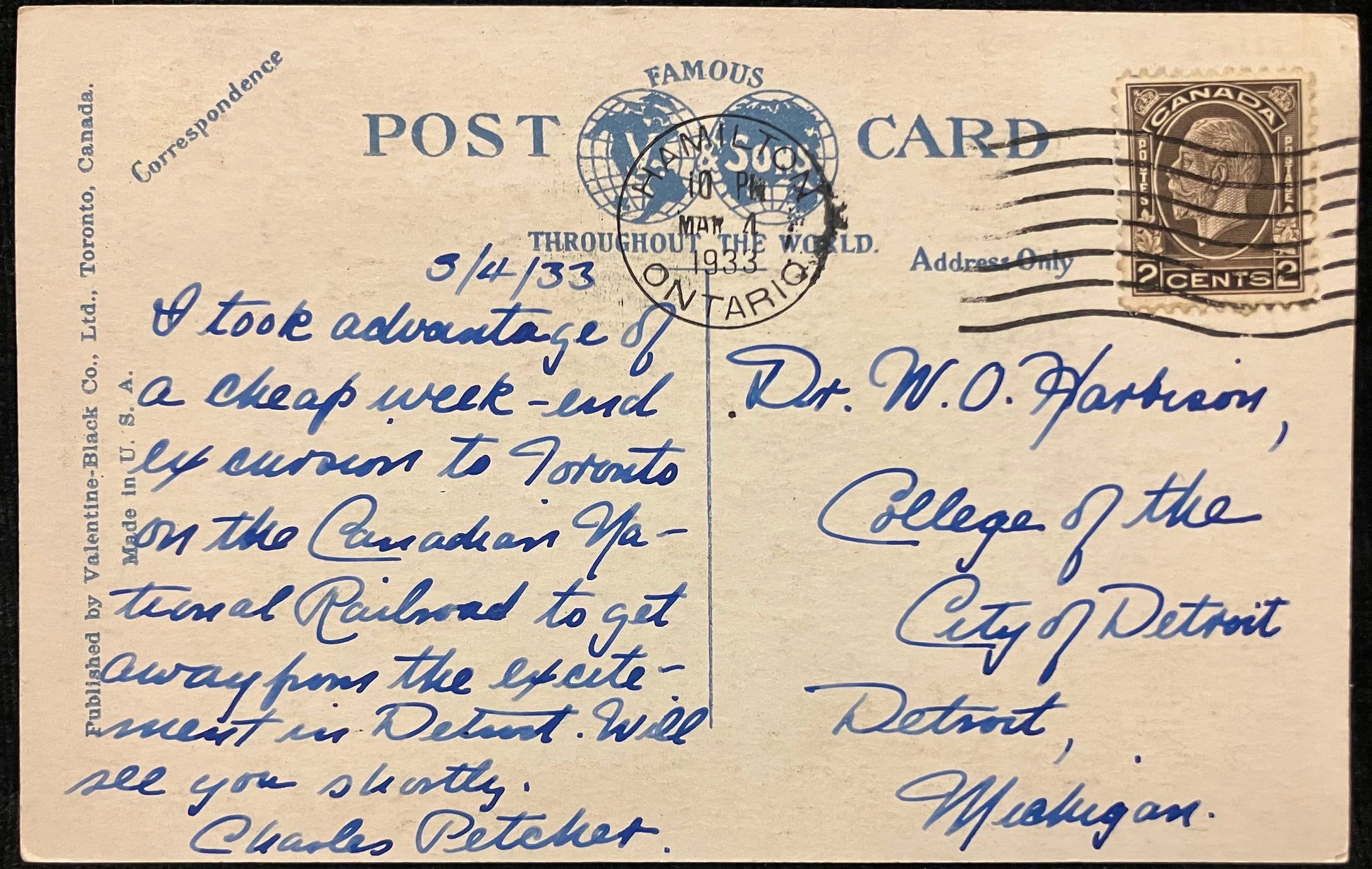 Mailed: Postmark on March 4, 1933 from Hamilton, Ontario with a brown two cent King George V stamp