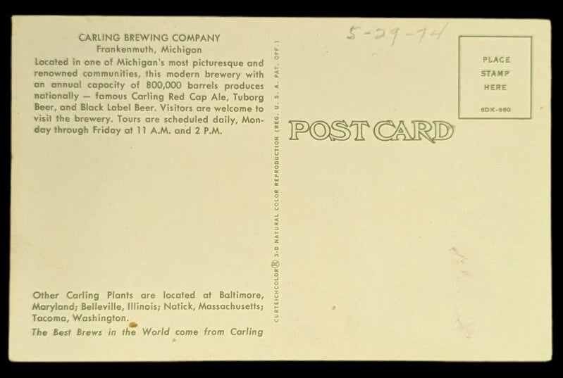 Back Info: Located in one of Michigan's most picturesque and renowned communities, this modern brewery with an annual capacity of 800,000 barrels produces nationally famous Carling Red Cap Ale, Tuborg Beer, and Black Label Beer. Visitors are welcome to visit the brewery. Tours are scheduled daily, Monday through Friday at 11 A.M. and 2 P.M.