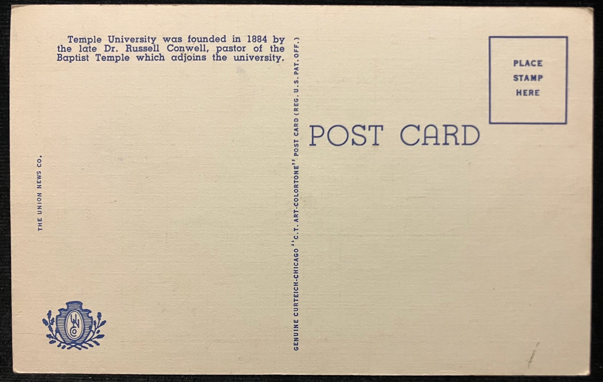 On back: Temple University was founded in 1884 by the late Dr. Russell Connell, pastor of the Baptist Temple, which adjoins the university.