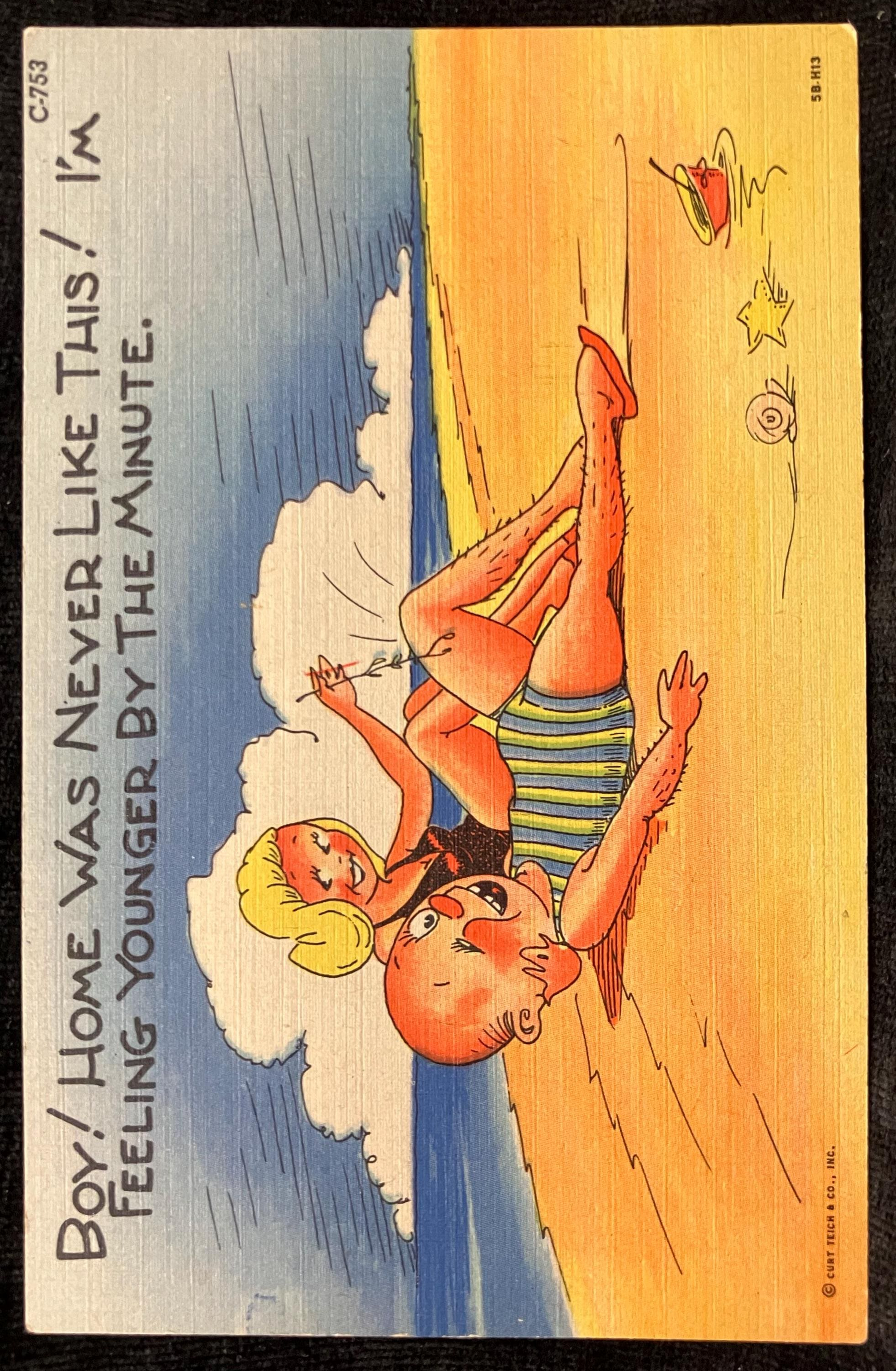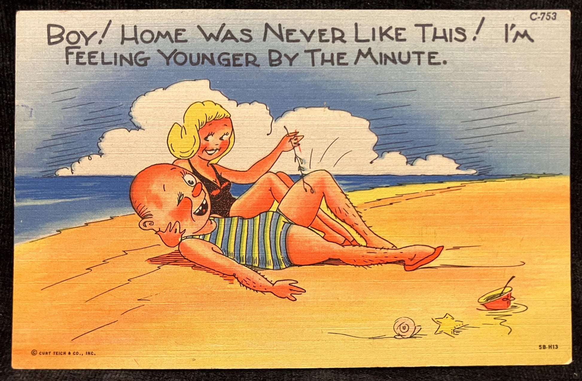 Cartoon Postcard - 1940s-50s - "Boy! Home was Never like This! I'm Feeling Younger by the Minute! - Vintage Cards
