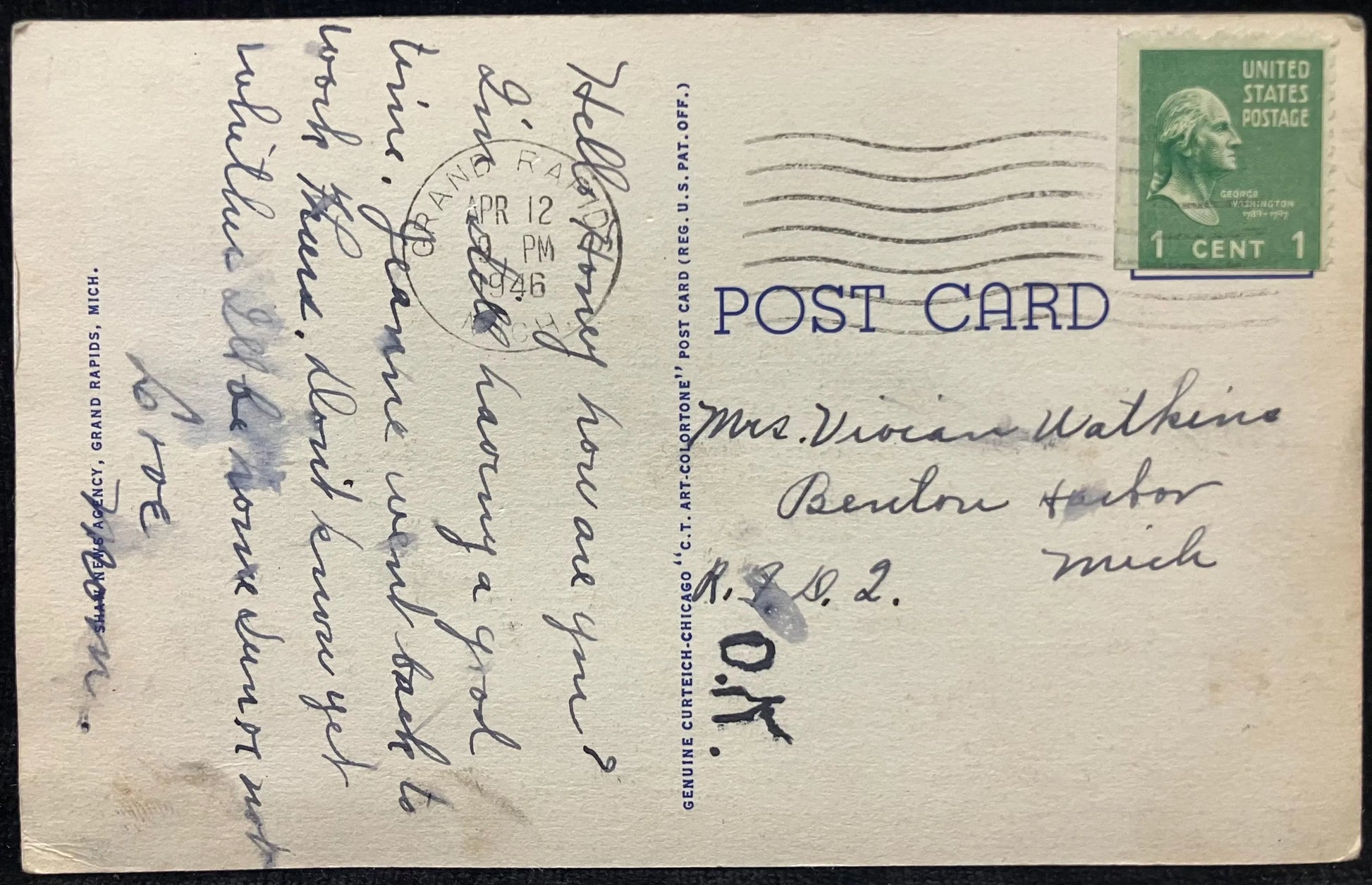Mailed: Postmark: 1946 green one-cent Benjamin Franklin stamp