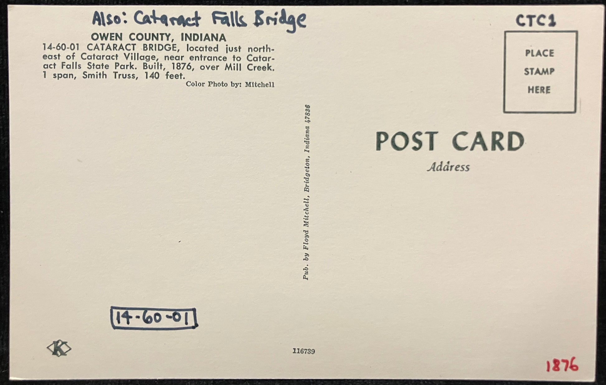 Back: OWEN COUNTY, INDIANA 14-60-01 CATARACT BRIDGE, located just northeast of Cataract Village, near entrance to Cataract Falls State Park. Built, 1876, over Mill Creek. 1 span, Smith Truss, 140 feet.