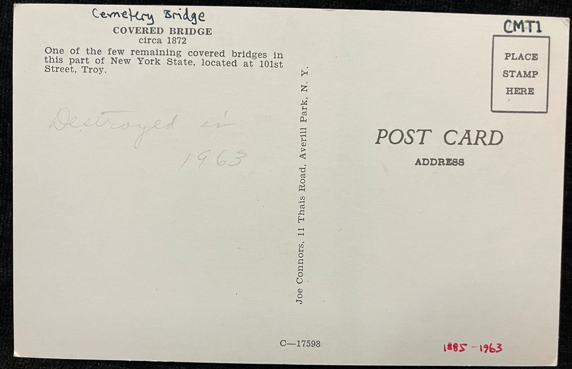 Back: Covered Bridge, circa 1872 One of the few remaining bridges in this part of New York State, located at 101st Street, Troy.