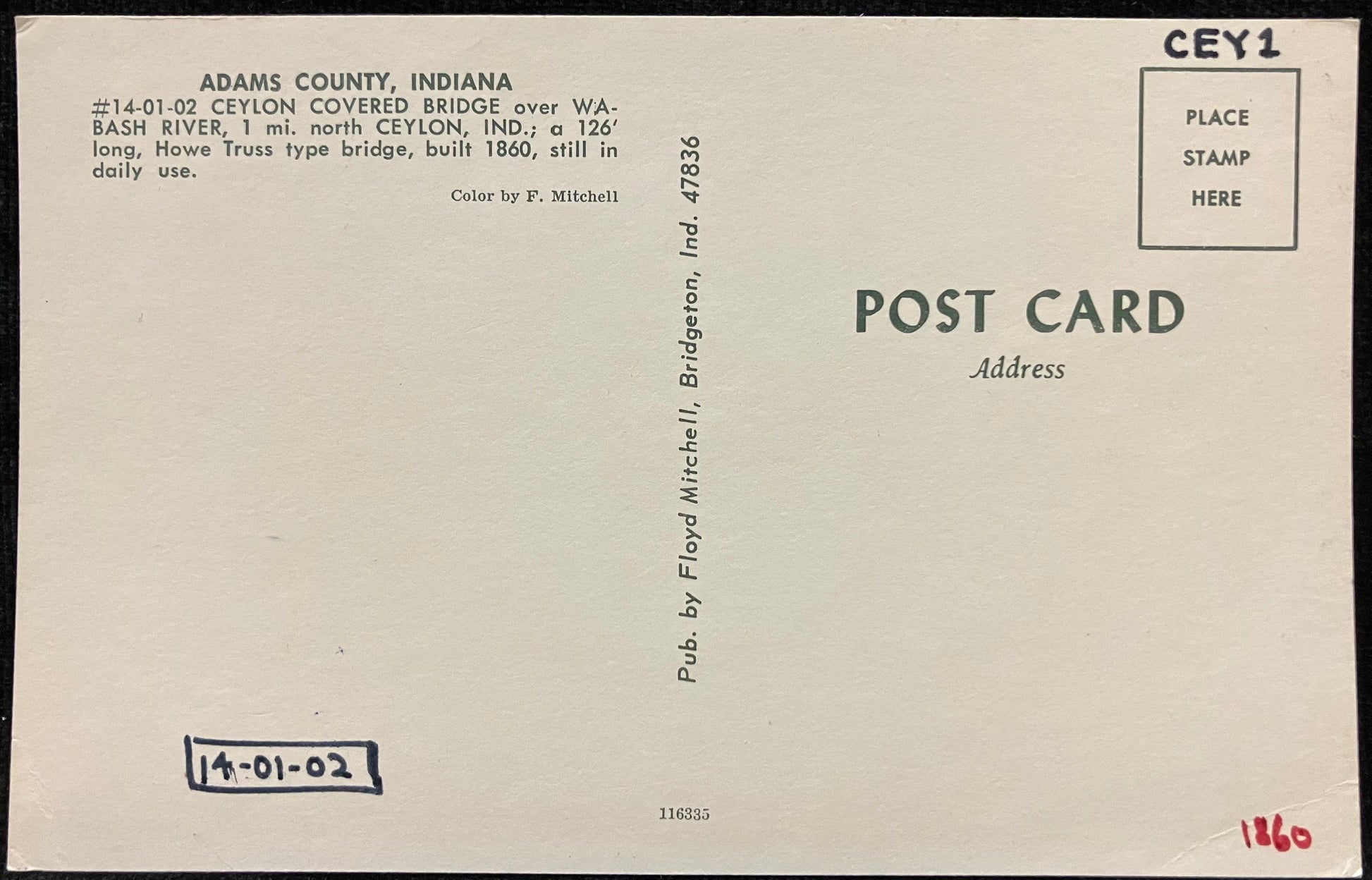 On front: A photo of Ceylon’s Covered Bridge over Washbash River in Adams County, Indiana
