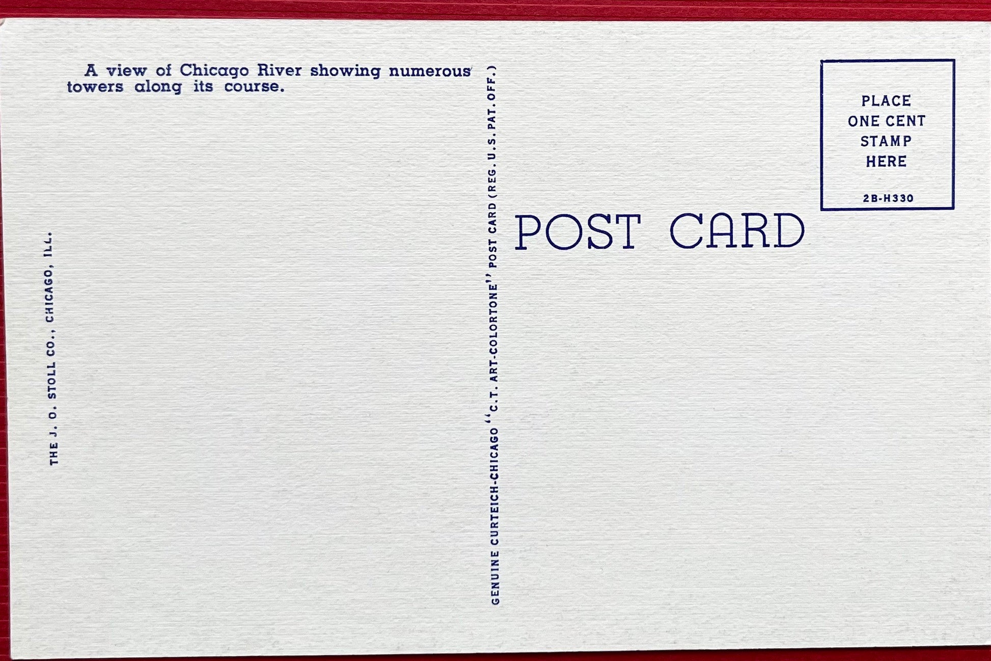 Back Text: "A view of Chicago River showing numerous towers along its course."