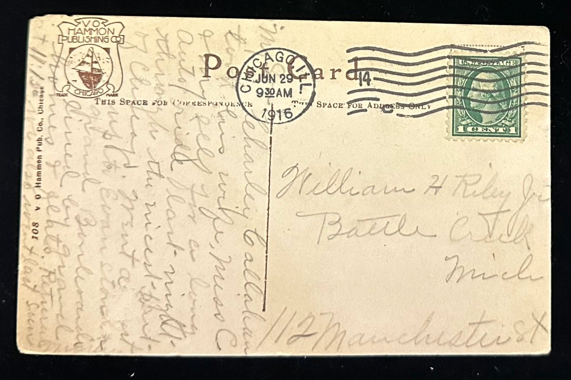 Mailed- Posted on Jun 29th, 1916, Green 1 cent Washington stamp