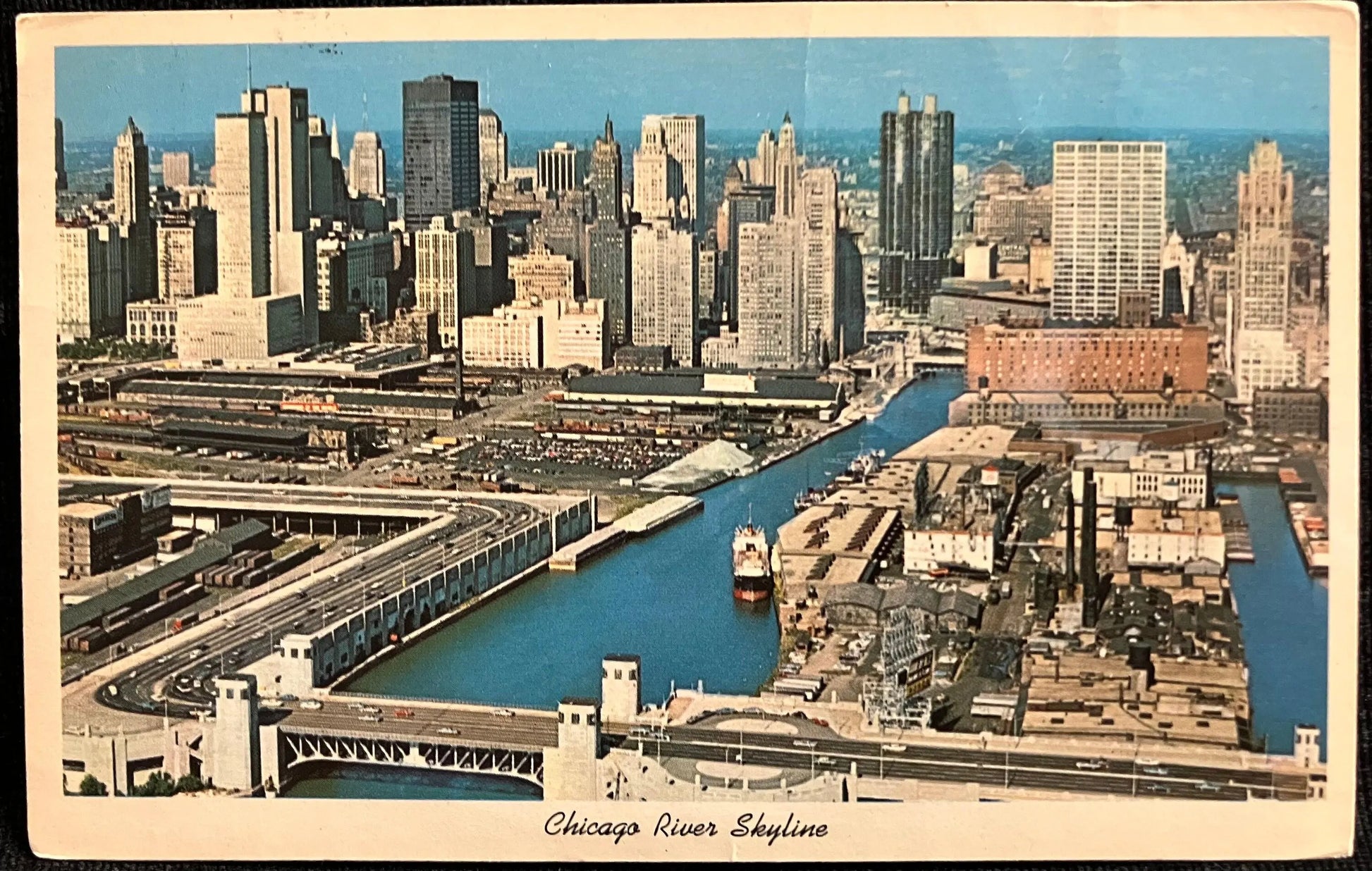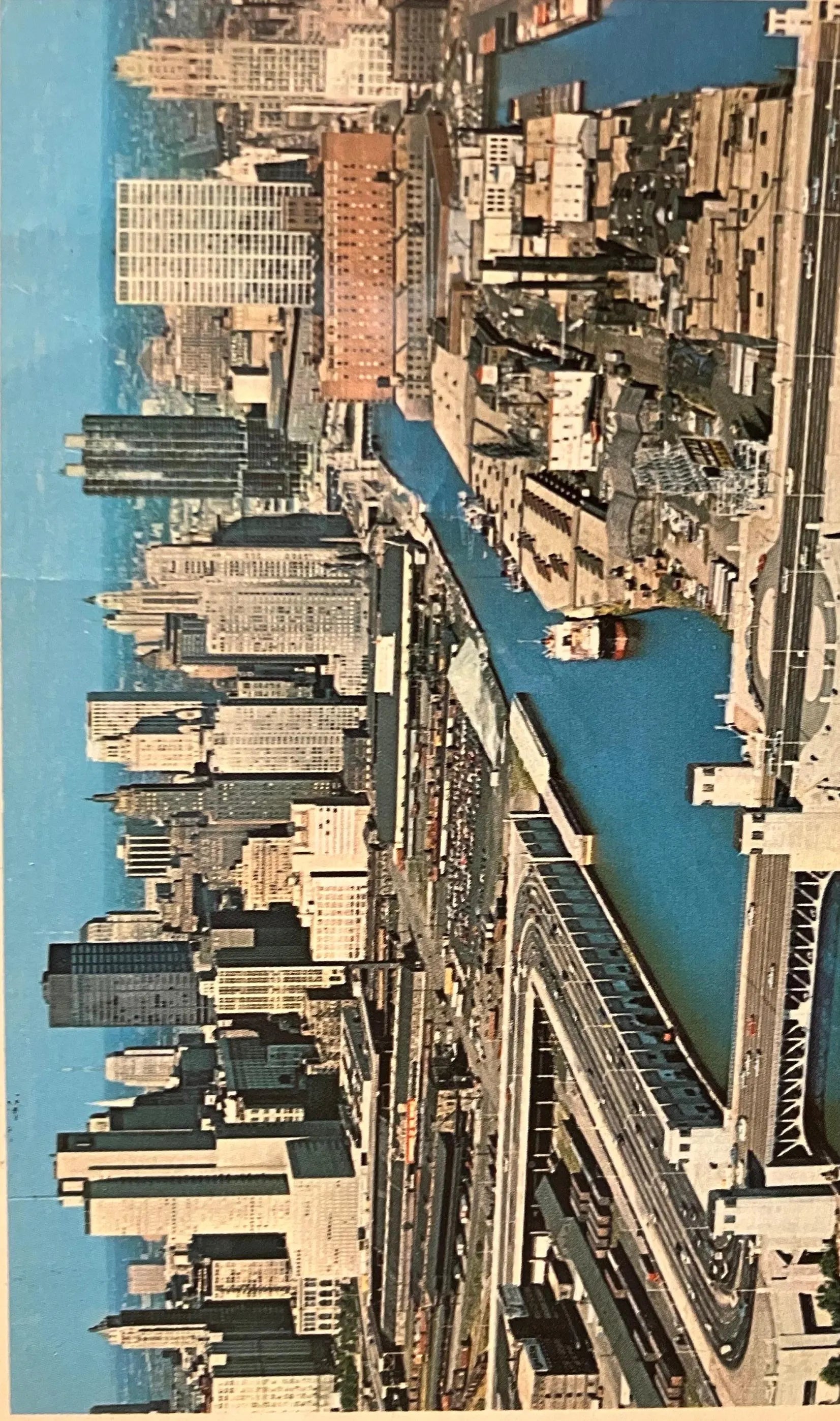 Chicago River Skyline - Illinois - Vintage Urban Bridge Postcard