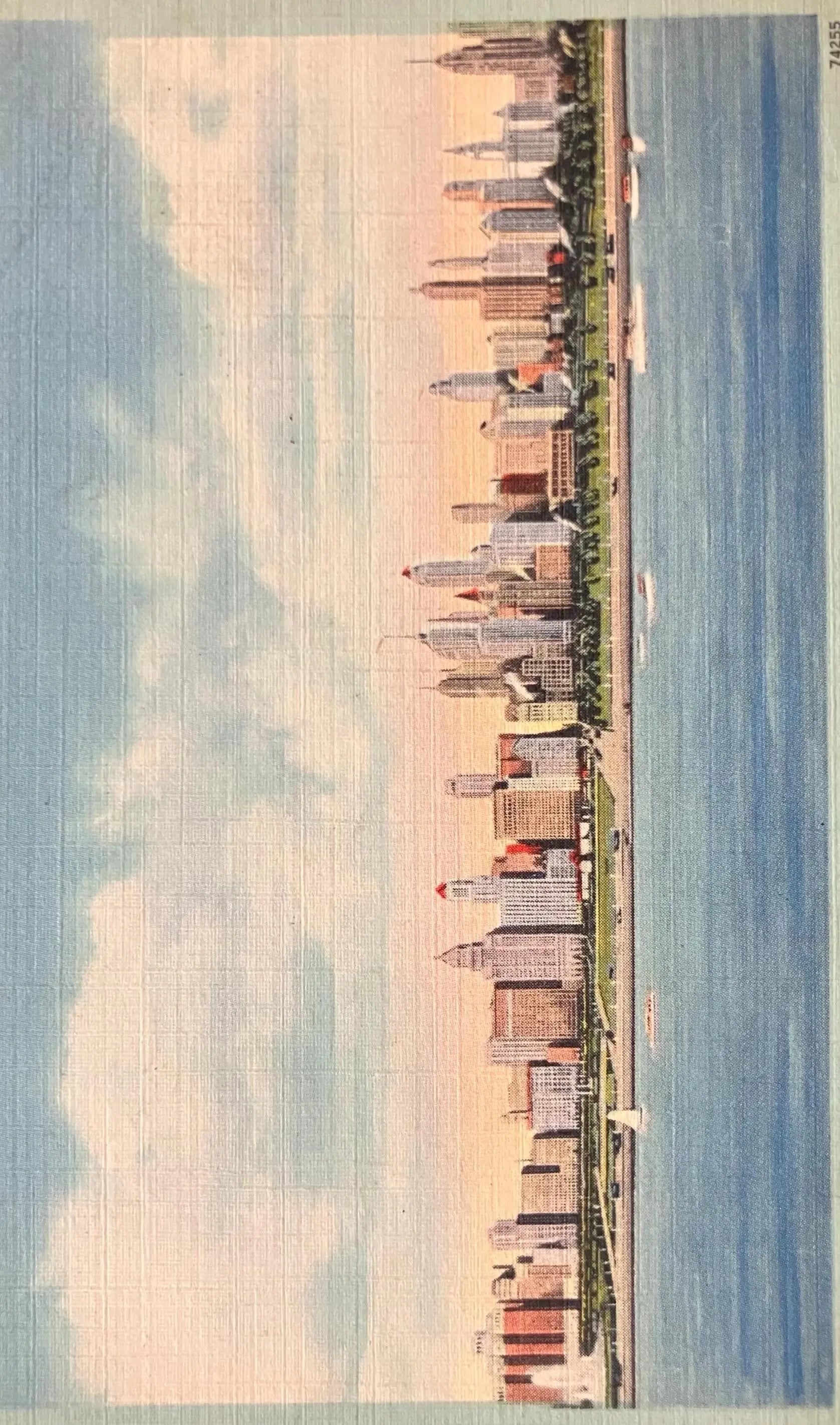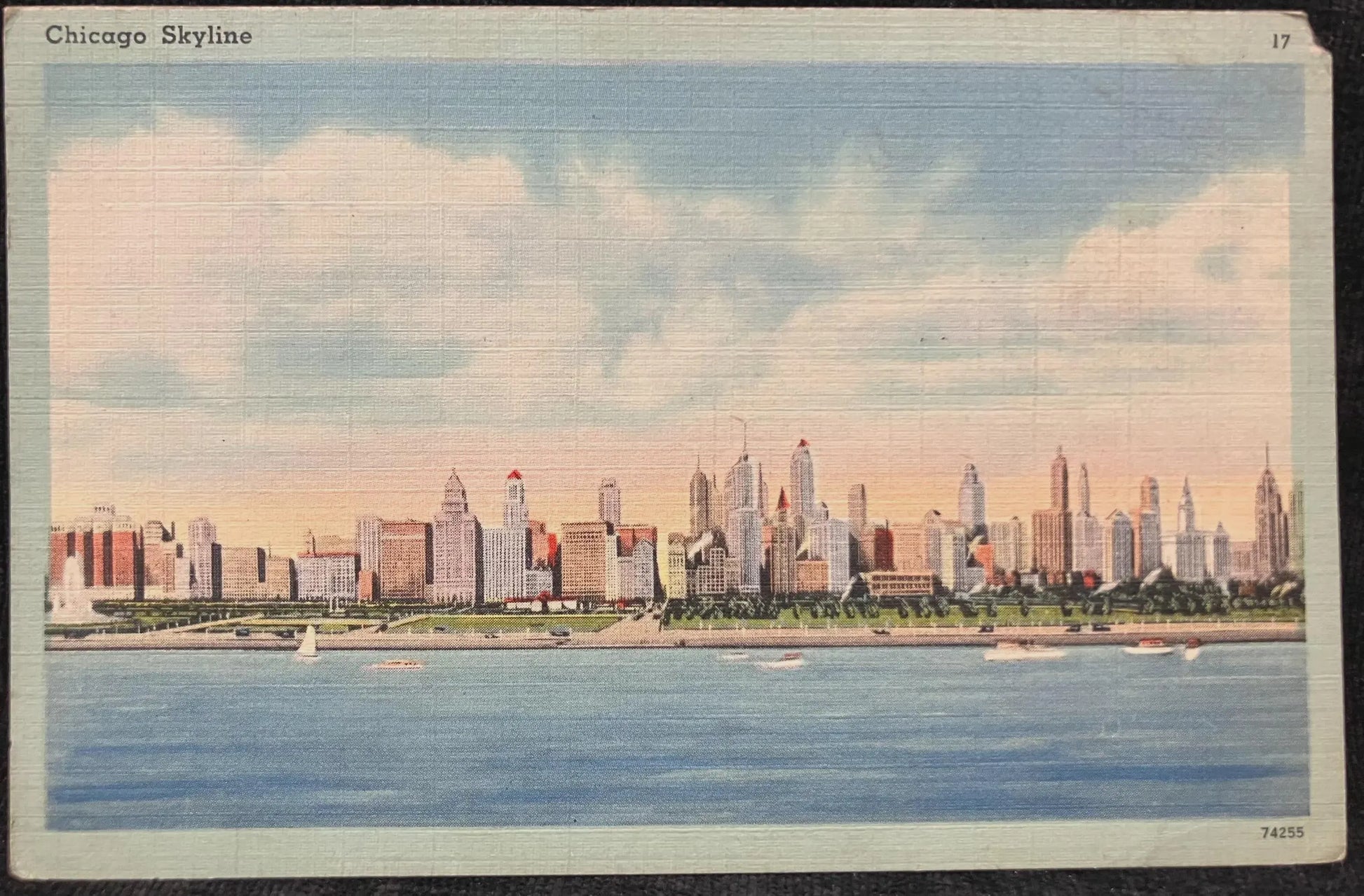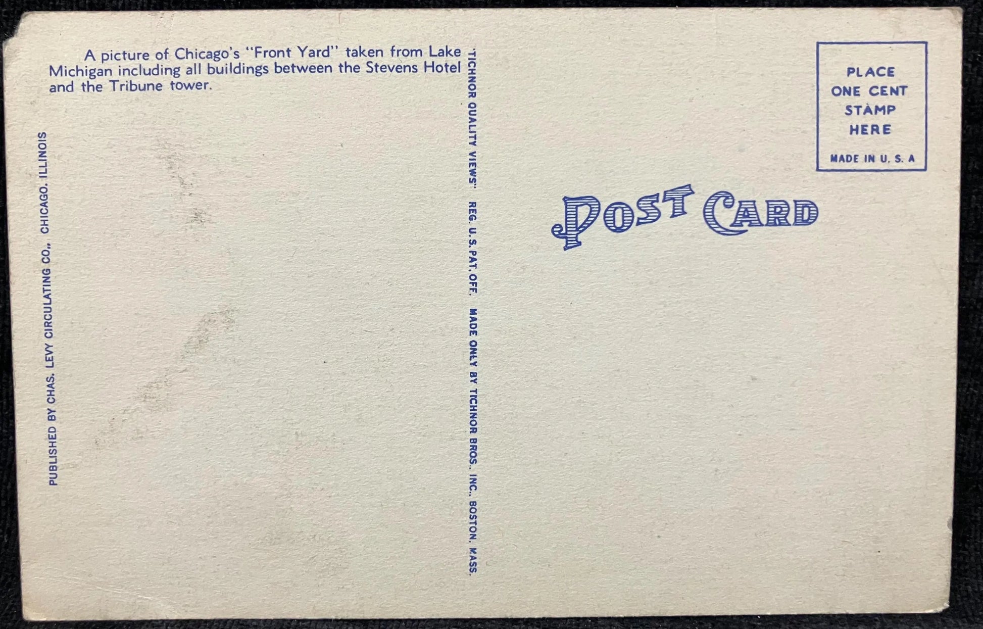 Back: A picture of Chicago's "Front Yard" taken form Lake Michigan including all buildings between the Stevens Hotel and the Tribune tower.