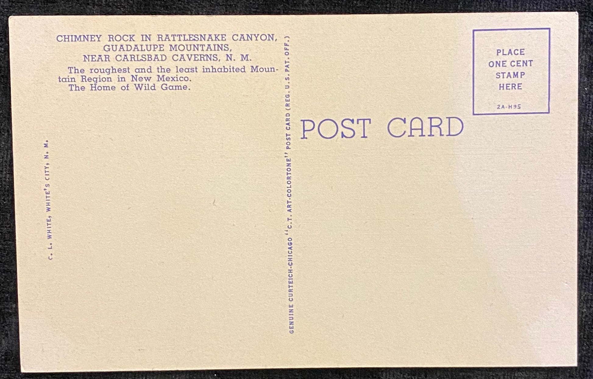 Back Information: "Chimney Rock in Rattlesnake Canyon, Guadalupe Mountains, Near Carlsbad Caverns, N.M. The roughest and the least inhabited Mountain Region in New Mexico. The Home of Wild Game."