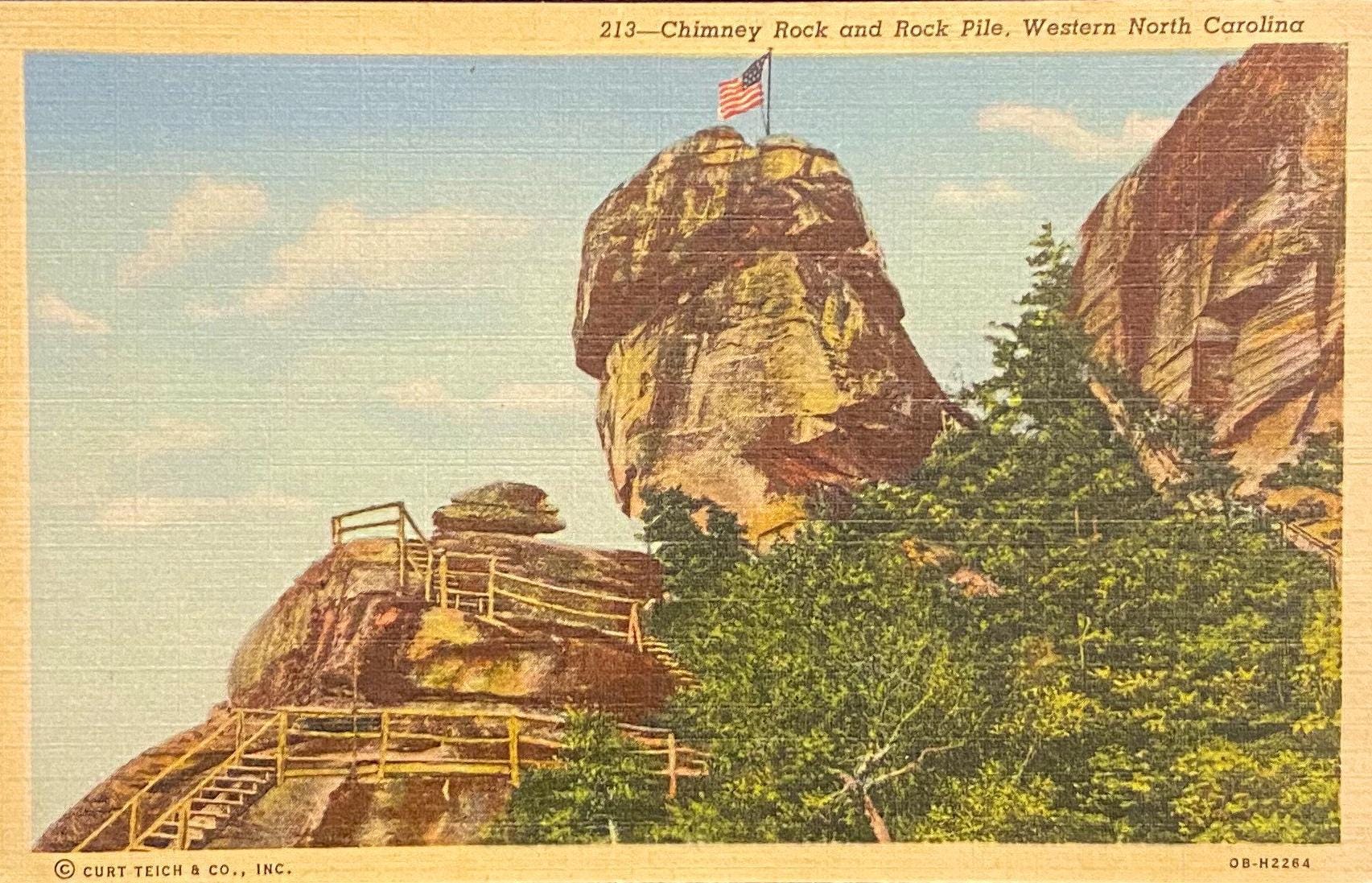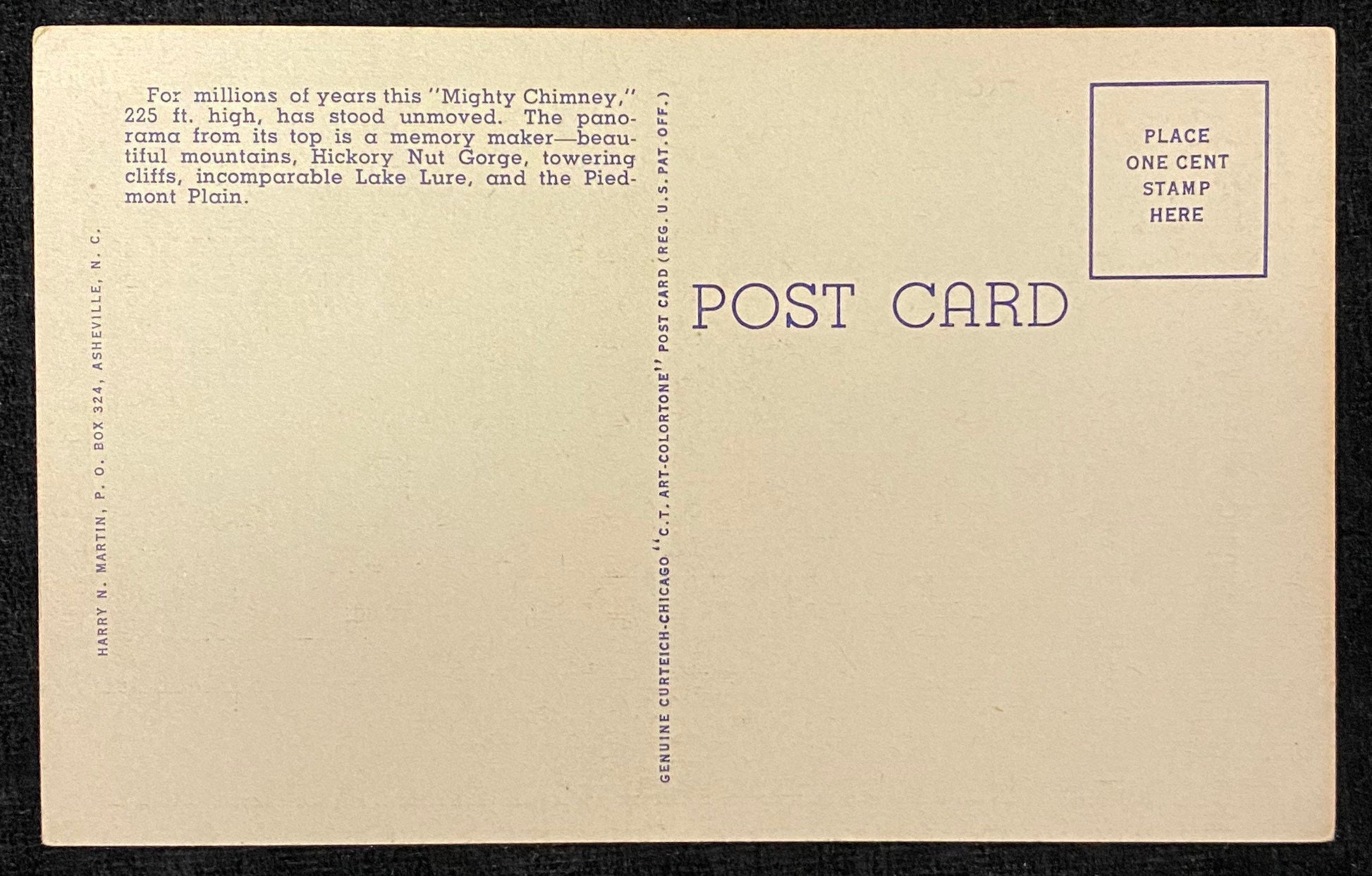 Back: "For millions of years this "Mighty Chimney," 225 ft. high, has stood unmoved. The panorama from its top is a memory maker - beautiful mountains, Hickory Nut Gorge, towering cliffs, incomparable Lake Lure, and the Piedmont Plan."