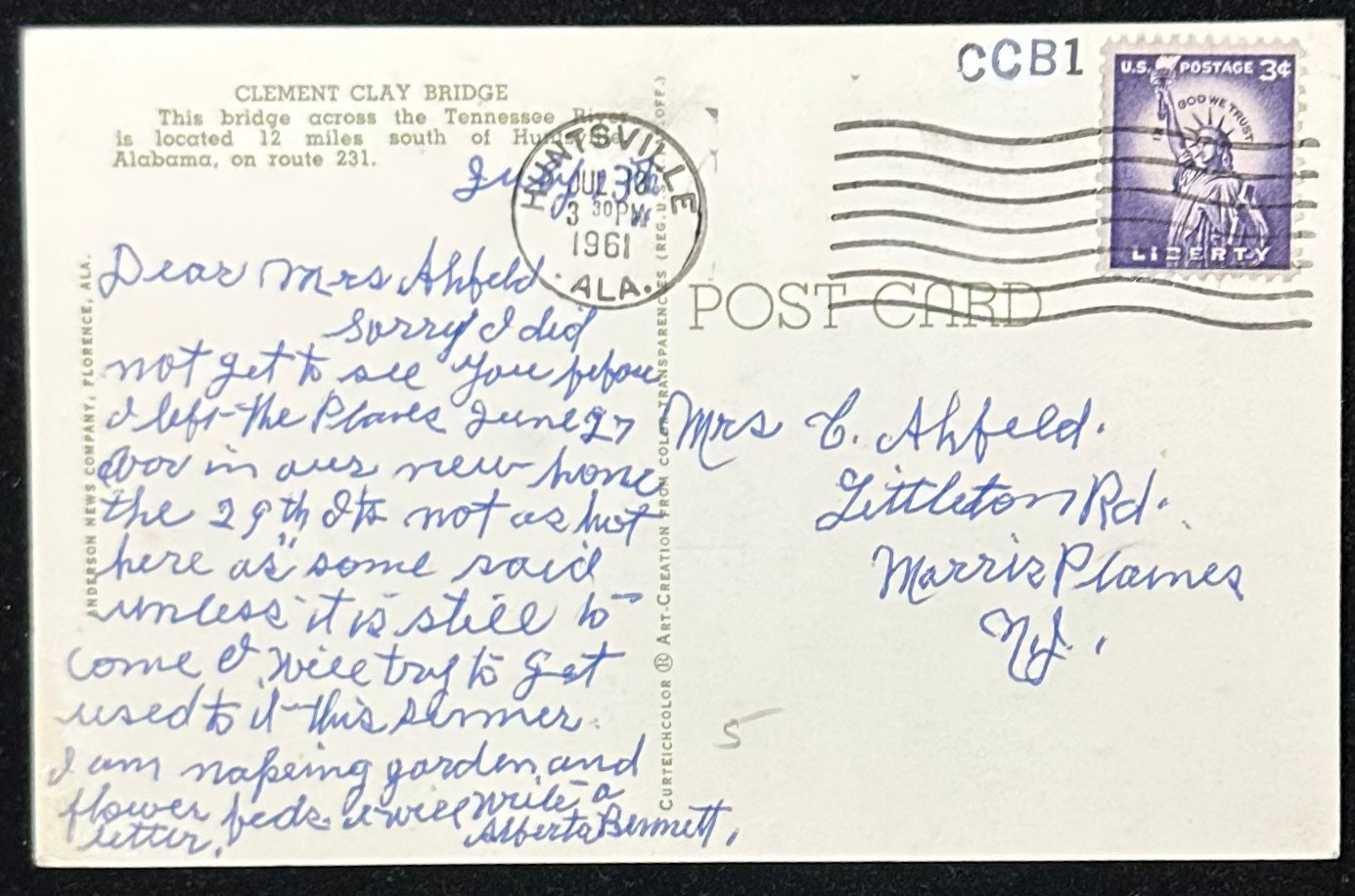 Mailed: Posted on July 3, 1961 from Huntsville, Alabama with a 3 cent Lilac Lady Liberty stamp