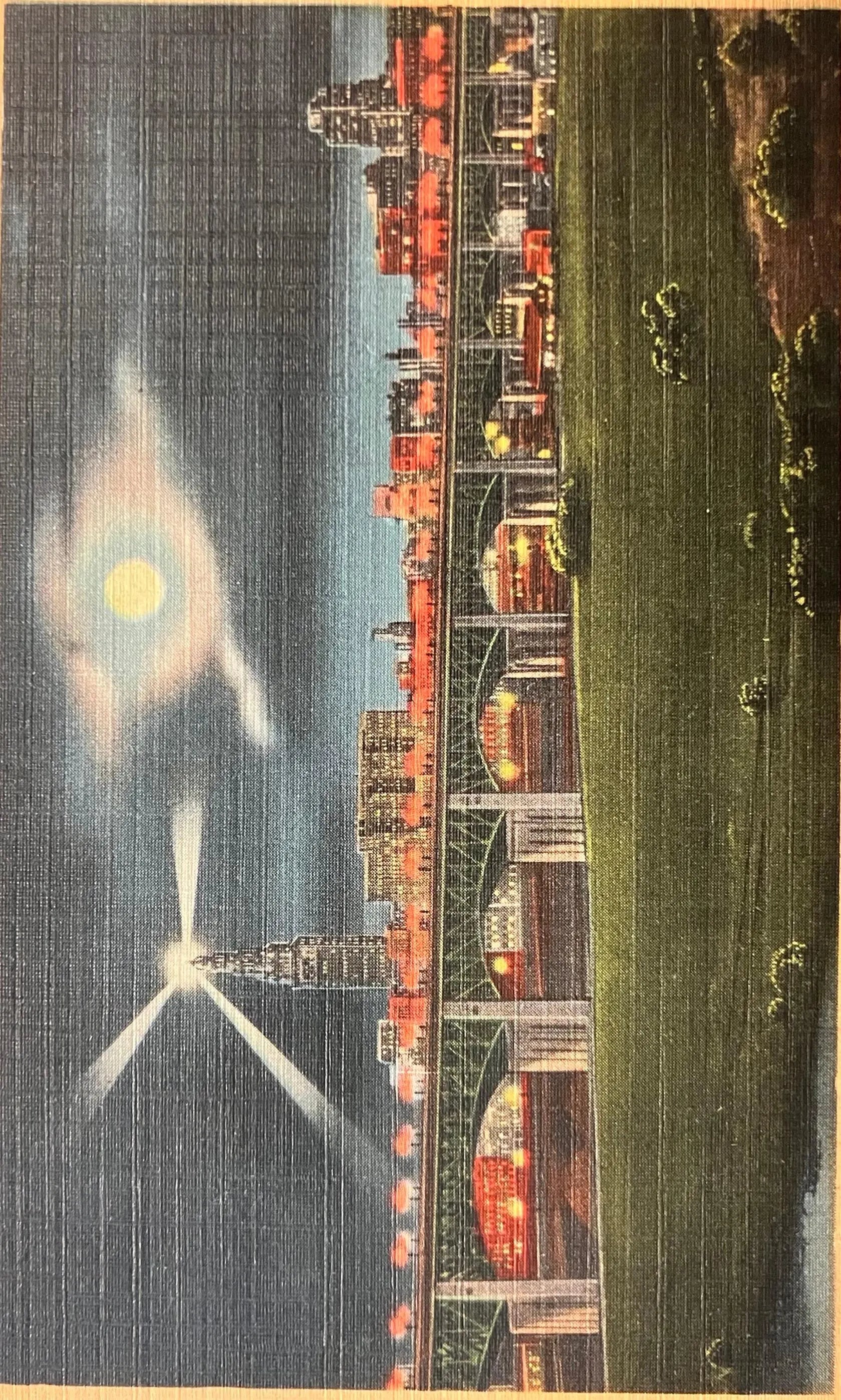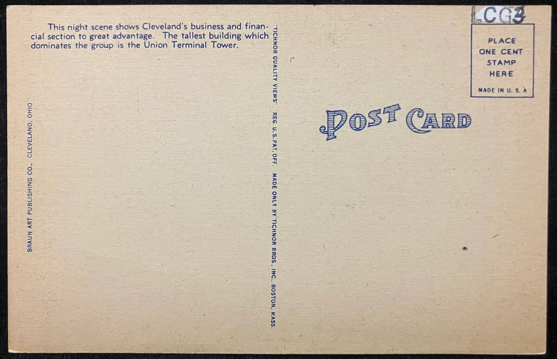 Back: This night scene shows Cleveland’s business and financial section to great advantage. The tallest building, which dominates the group, is the Union Terminal Tower