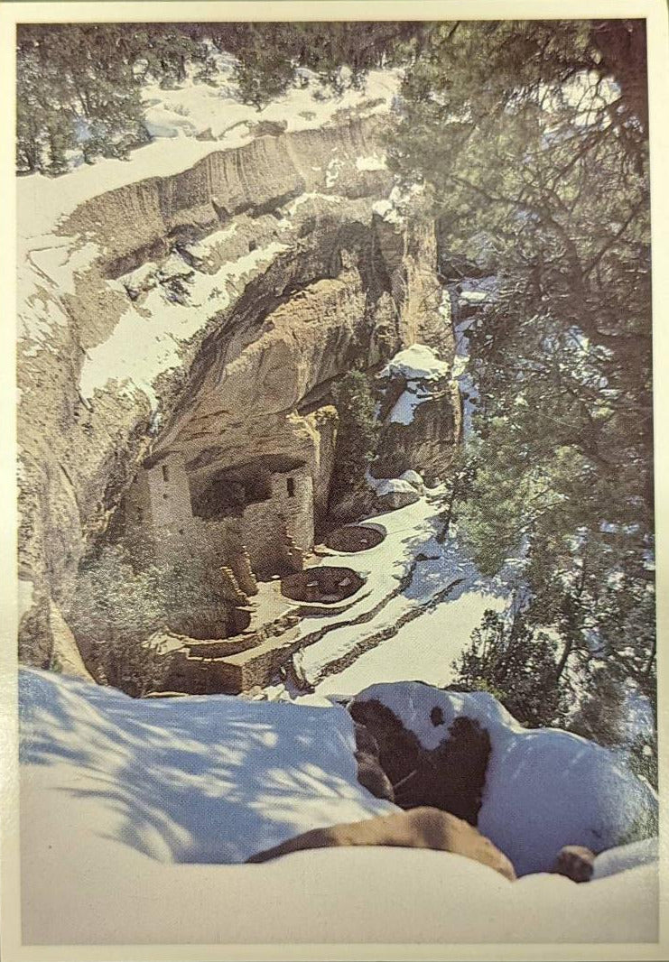 Front: Beautiful photograph depicting the Cliff Palace in Mesa Verde National Park during winter