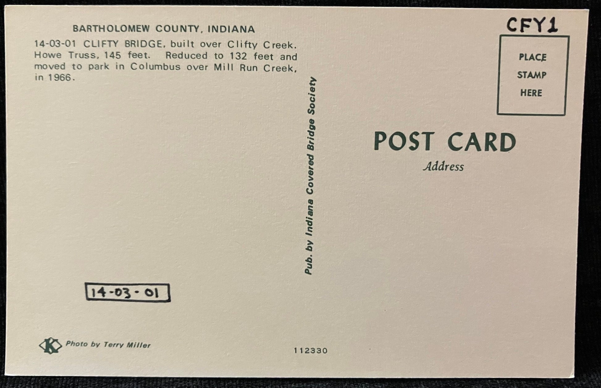 Clifty Bridge in Bartholomew County, Indiana - Photo byTerry Miller - Vintage Covered Bridge Postcard