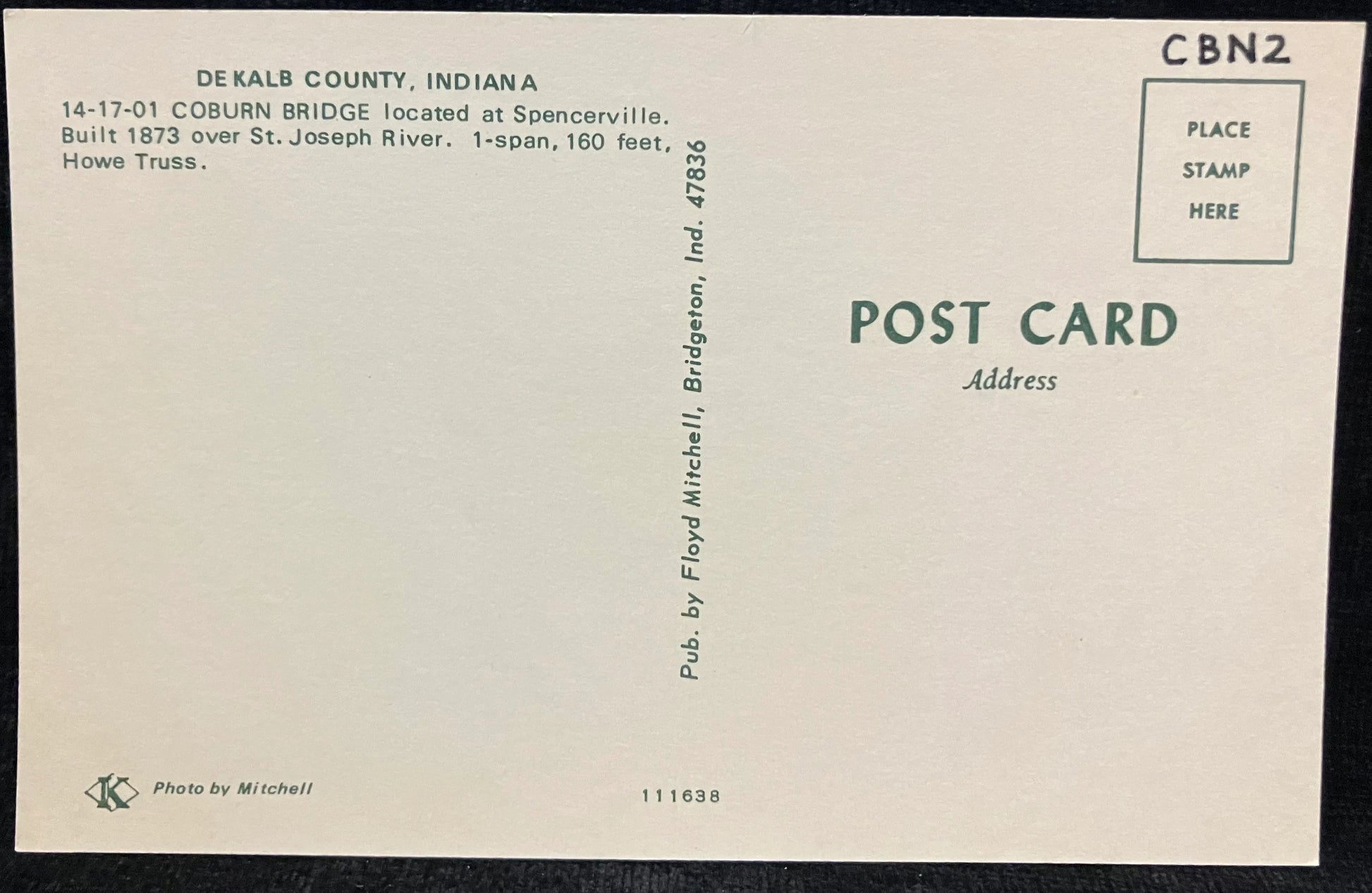 Back: Dekalb County, Indiana 14-17-01 Coburn Bridge located at Spencerville Built 1873 over St. Joseph River. 1-span, 160 feet, Howe Truss.