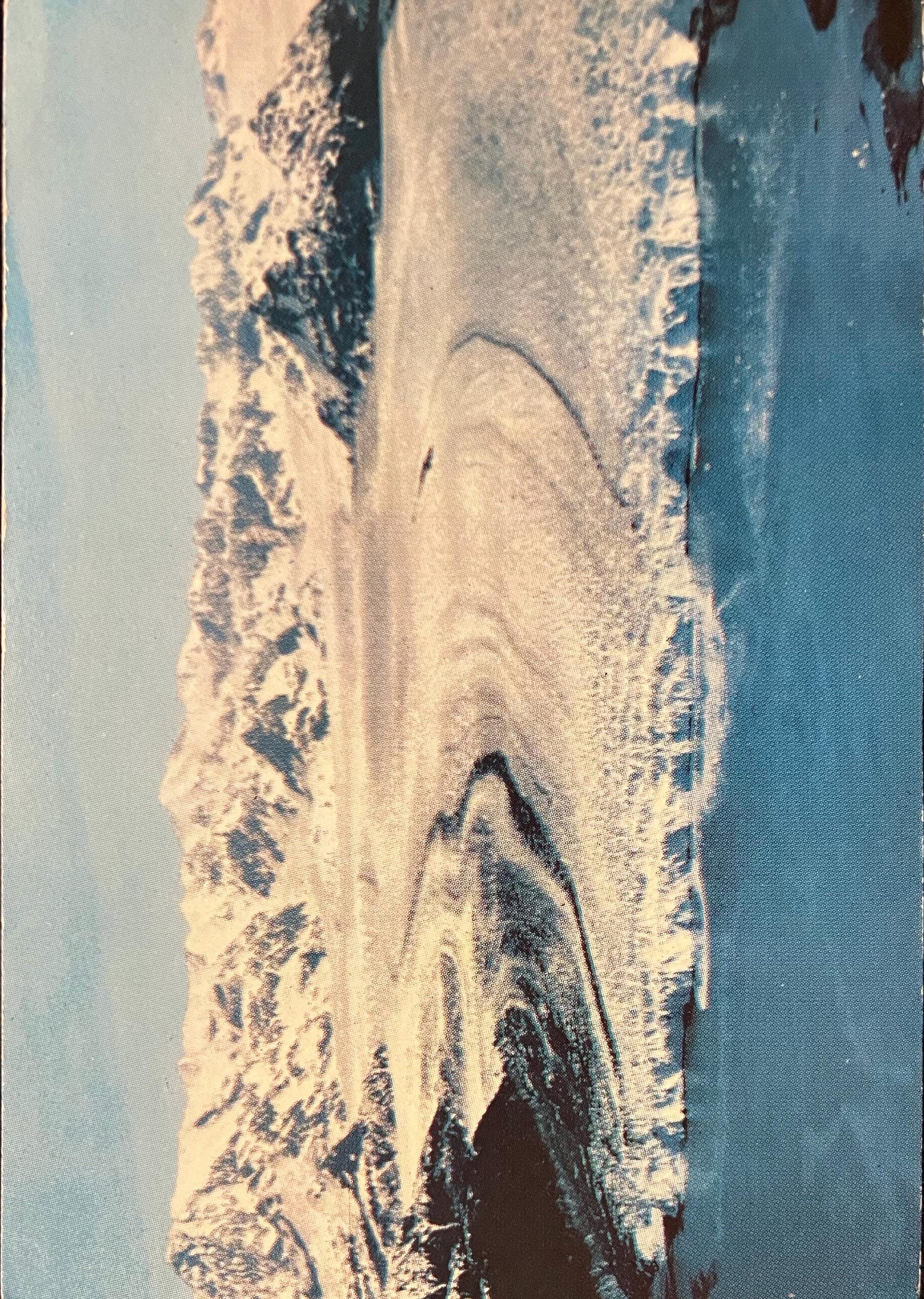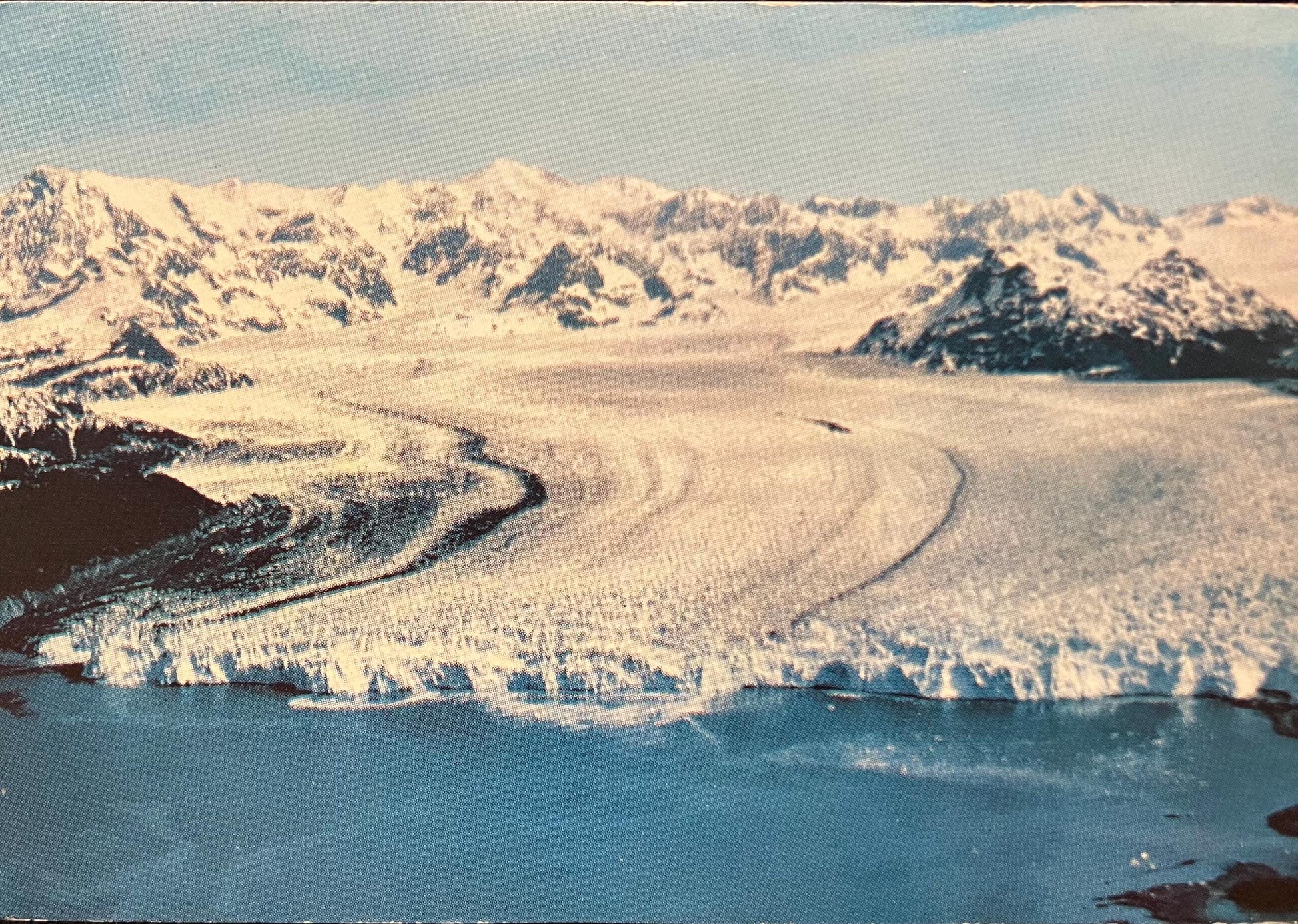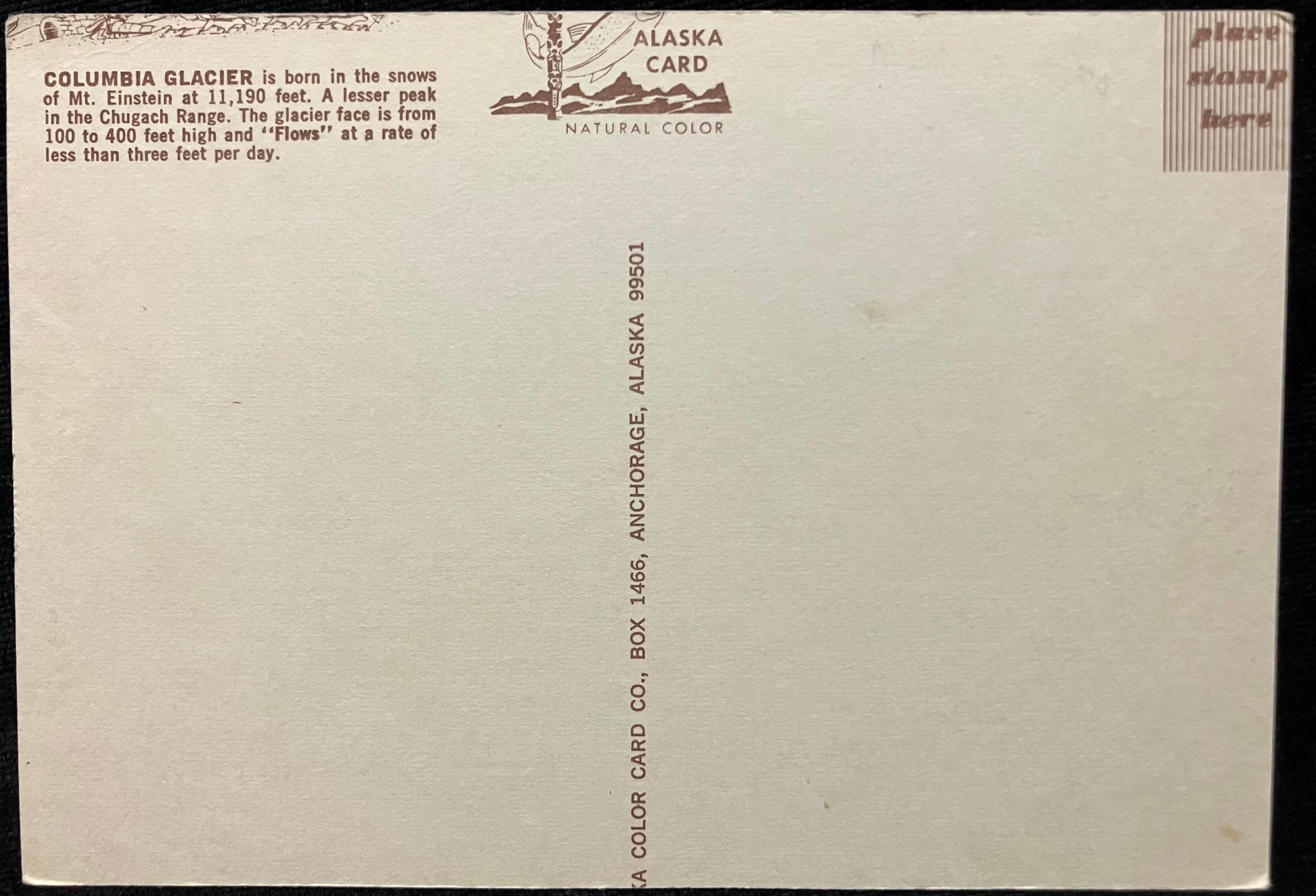 Back: Columbia Glacier is born in the snows of Mt. Einstein at 11,190 feet. A lesser peak in the Chugach Range. The glacier face is from 100 to 400 feet high and “Flows” at a rate of less than three feet per day.