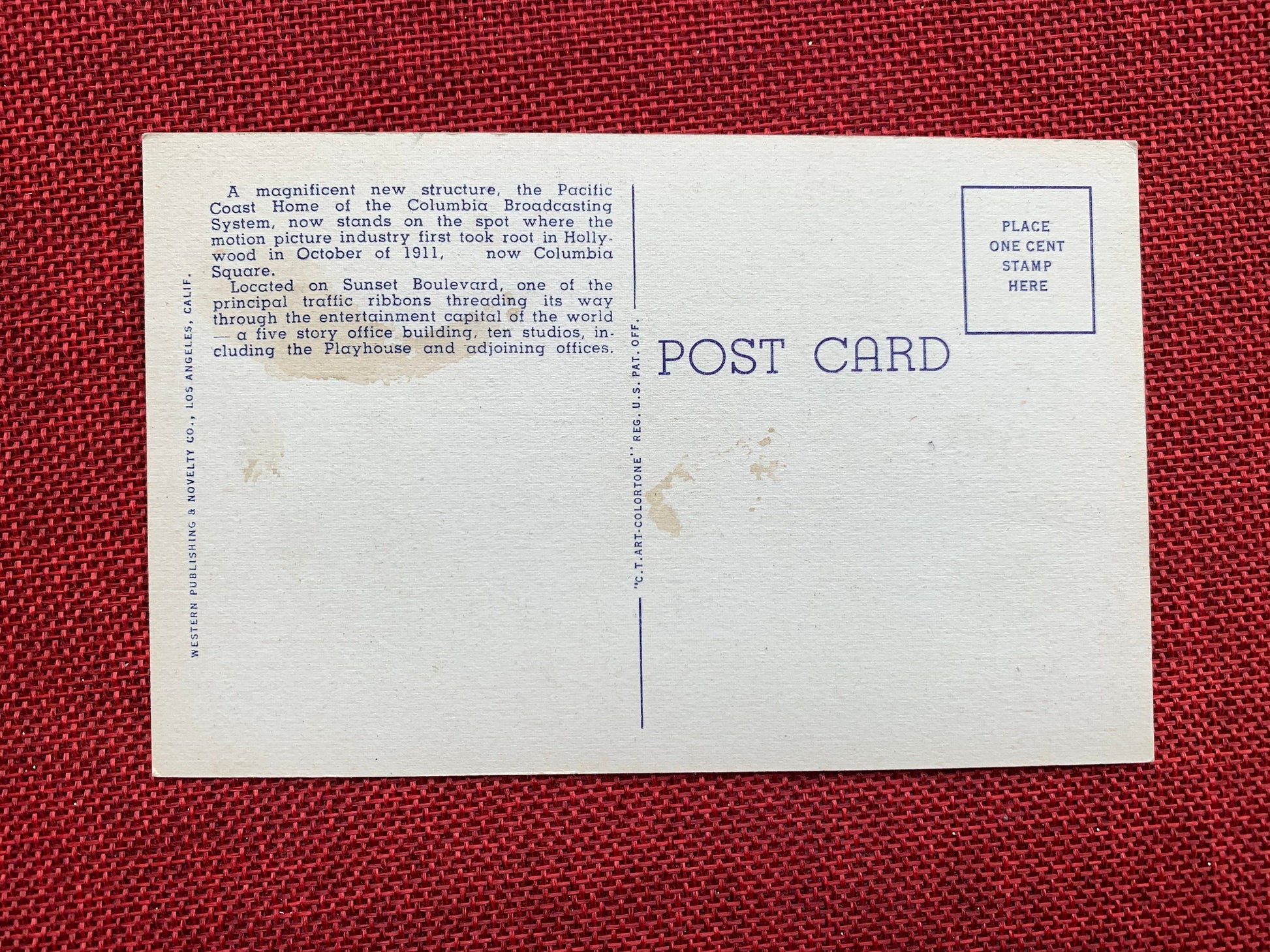 Back Text: "A magnificent new structure, the Pacific Coast Home of the Columbia Broadcasting System, now stands on the spot where the motion picture industry first took root in Hollywood in October of 1911, now Columbia Square. Located on Sunset Boulevard, one of the principal traffic ribbons threading its way through the entertainment capital of the world - a five story office building, ten studios, including the Playhouse and adjoining offices."