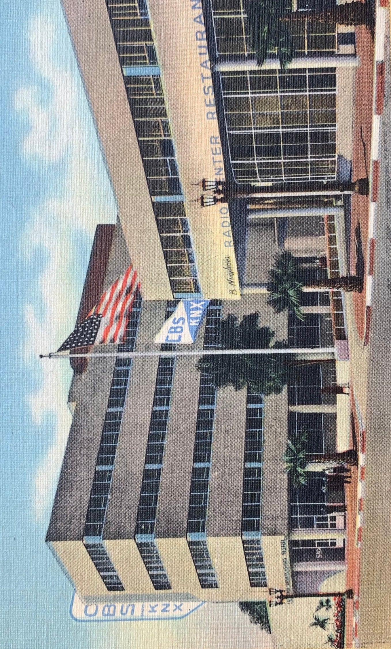 This linen postcard features a hand tinted photograph of Columbia Square, the home of KNX Columbia Broadcasting System in Hollywood, California.