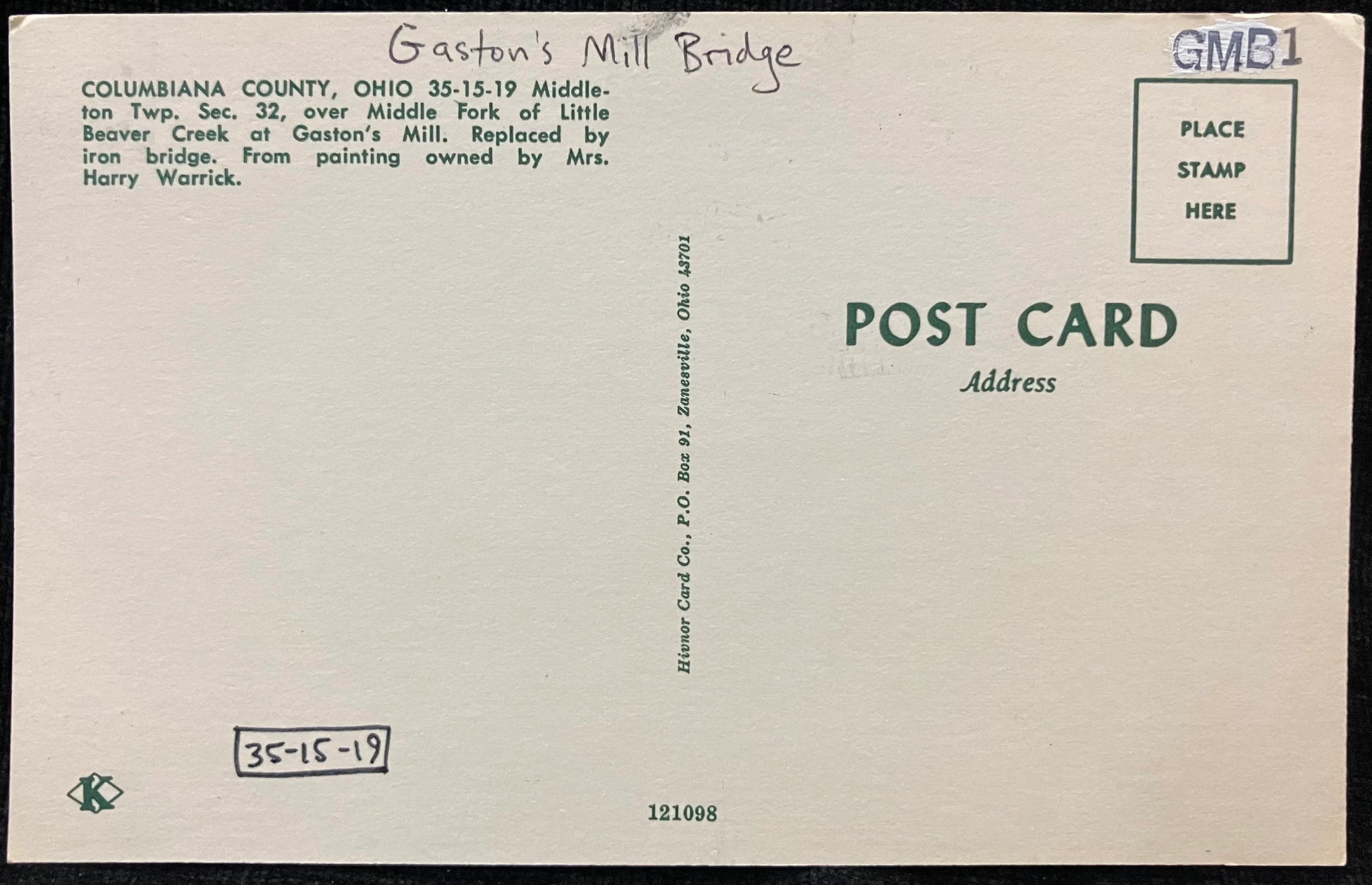 Back: COLUMBIANA COUNTY, OHIO 35-15-19 Middleton Twp. Sec. 32, over Middle Fork of Little Beaver Creek at Gaston’s Mill. Replaced by iron bridge. From a painting owned by Mrs. Harry Warwick.
