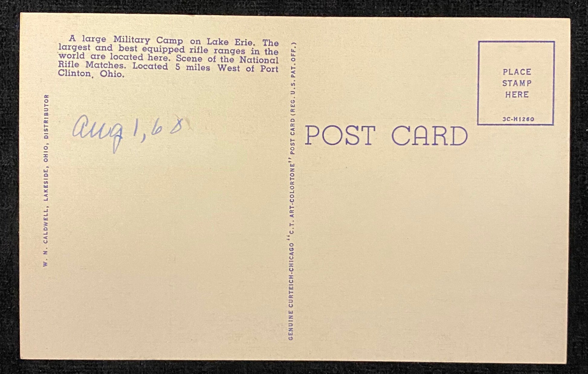 Back: "A large Military Camp on Lake Erie. The largest and best-equipped rifle ranges in the world are located here. Scene of the National Rifle Matches. Located 5 miles West of Port Clinton, Ohio."