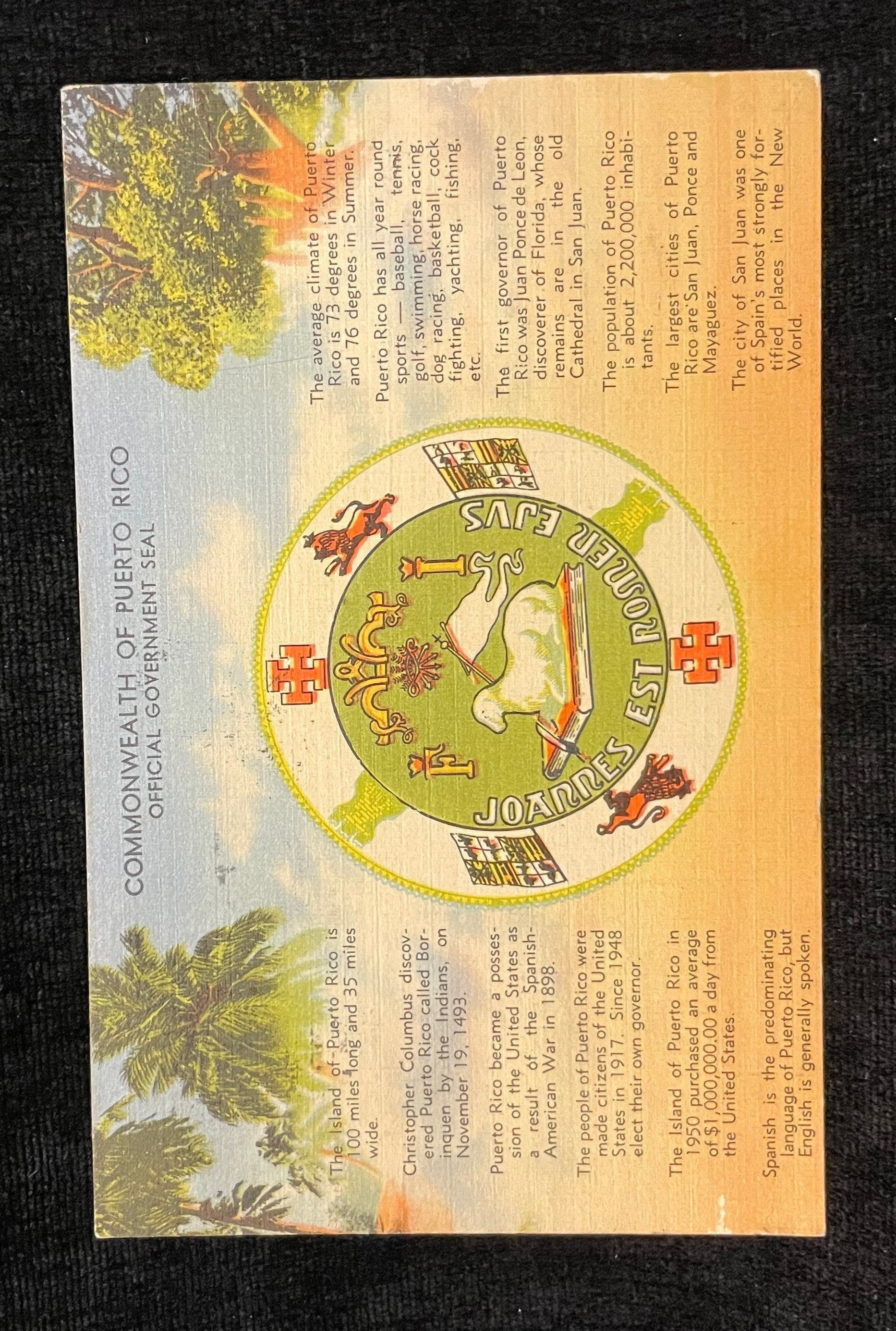 This post card displays the old official governmental seal of Puerto Rico. The seal has been updated in recent years.