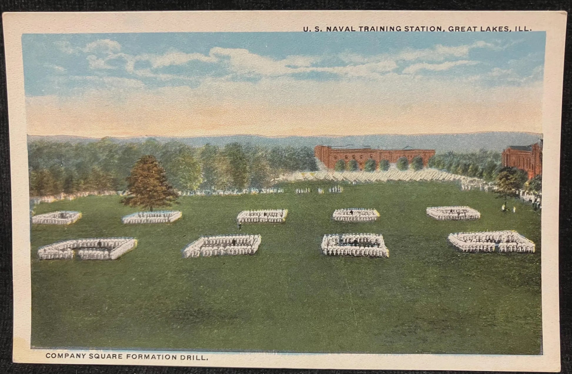 Company Square Formation Drill - U. S. Naval Training Station, Great Lakes, Illinois - Vintage Navy Postcard