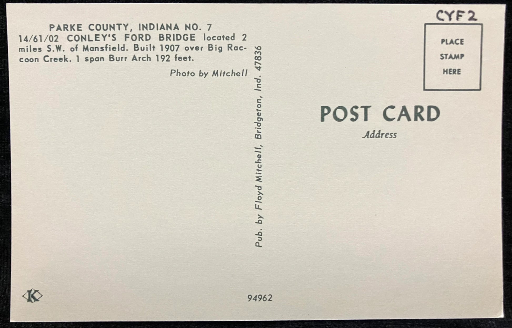 Back: Parke County, Indiana No. 7 14/61/02 Conley’s Ford Bridhe located 2 miles S.W. of Mansfield. Built 1907 over a big Racoon Creek. 1 span Burr Arch 192 feet.
