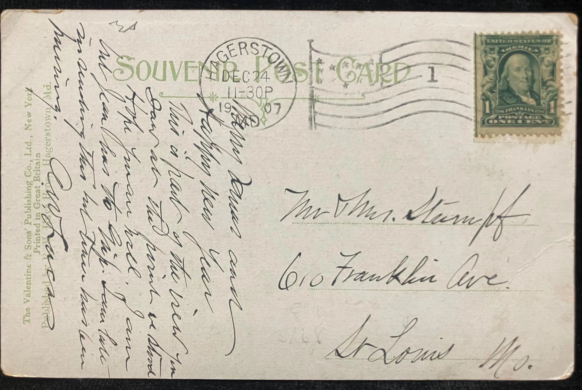 Mailed: Dec, 24 1907. Green one cent Benjamin Franklin stamp