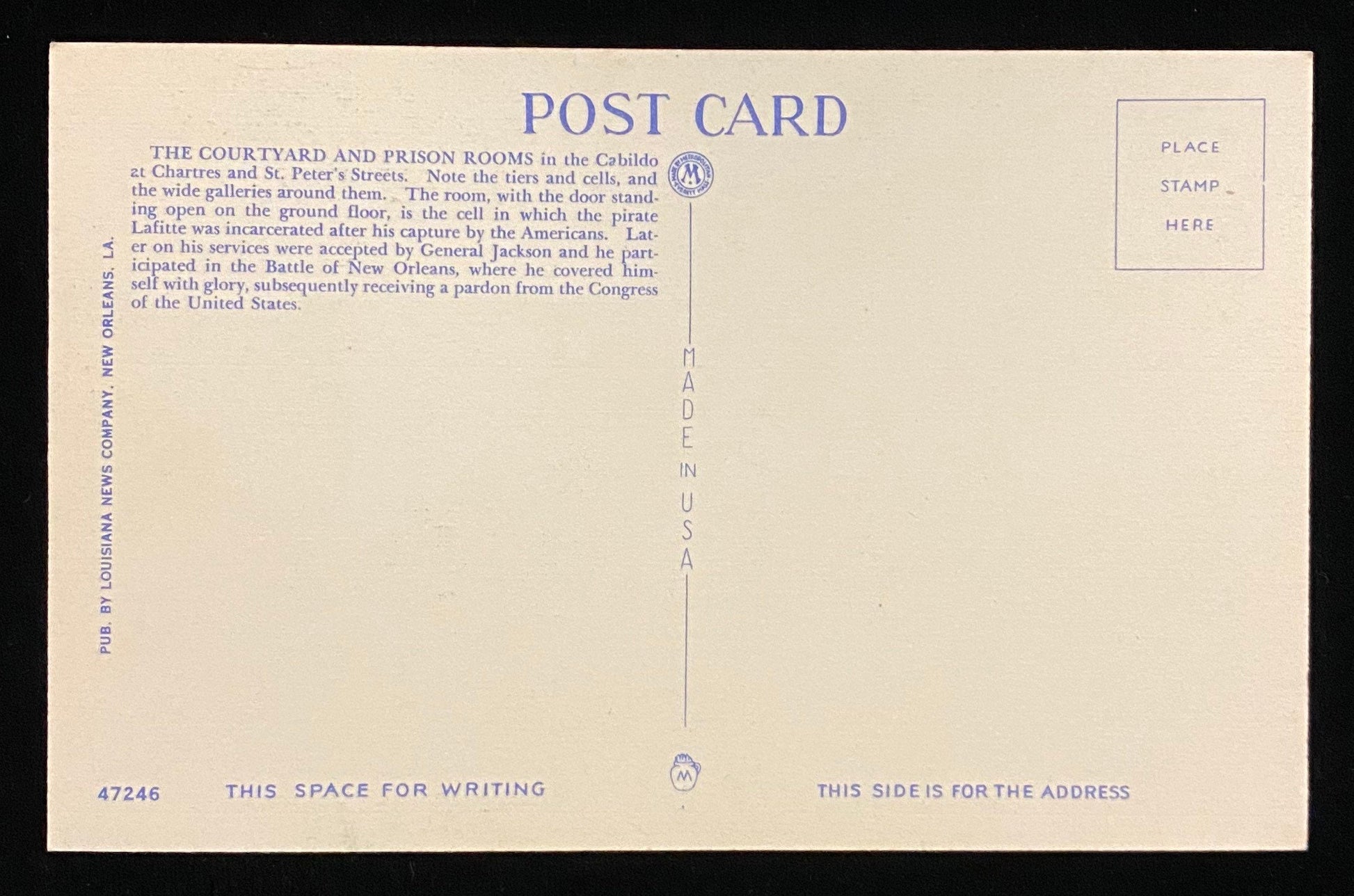 Back: "The courtyard and prison rooms in the Cabildo at Chartres and St. Peter's Streets. Note the tiers and cells, and the wide galleries around them. The room, with the door standing open on the ground floor, is the cell in which the pirate Lafitte was incarcerated after his capture by the Americans. Later on his services were accepted by General Jackson and he participated in the Battle of New Orleans, where he covered himself with glory, subsequently receiving a pardon from the Congress of the United States."