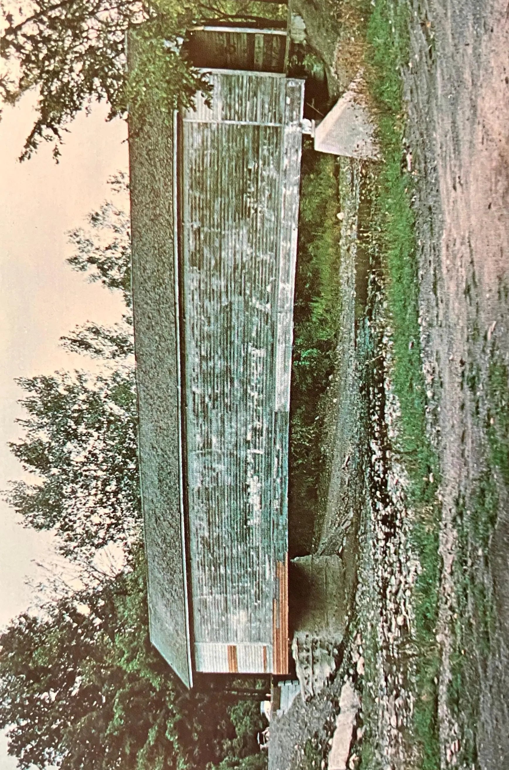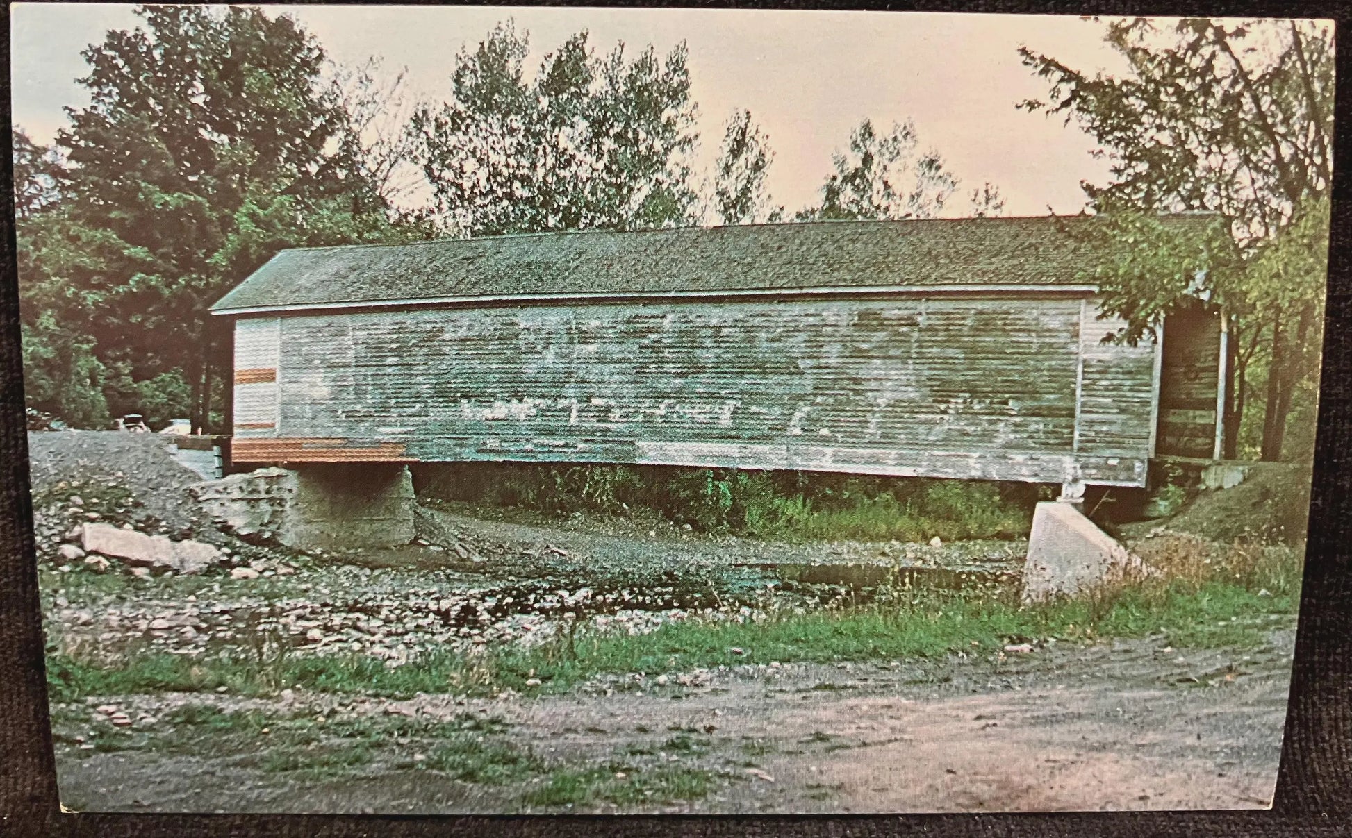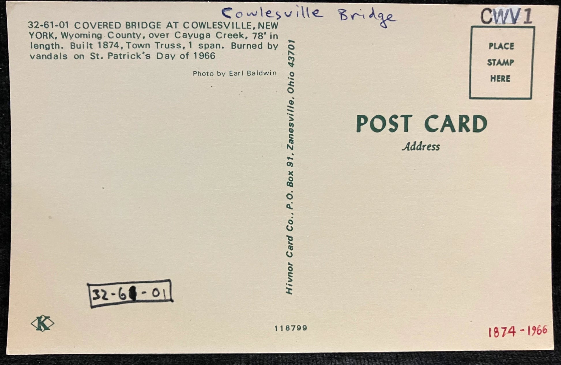 Back: Covered Bridge at Cowlesville, New York, Wyoming County, over Cayuga Creek, 78’ in length. Built 1874, Town Truss, 1 span. Burned by vandals on St. Patrick’s Day of 1966.