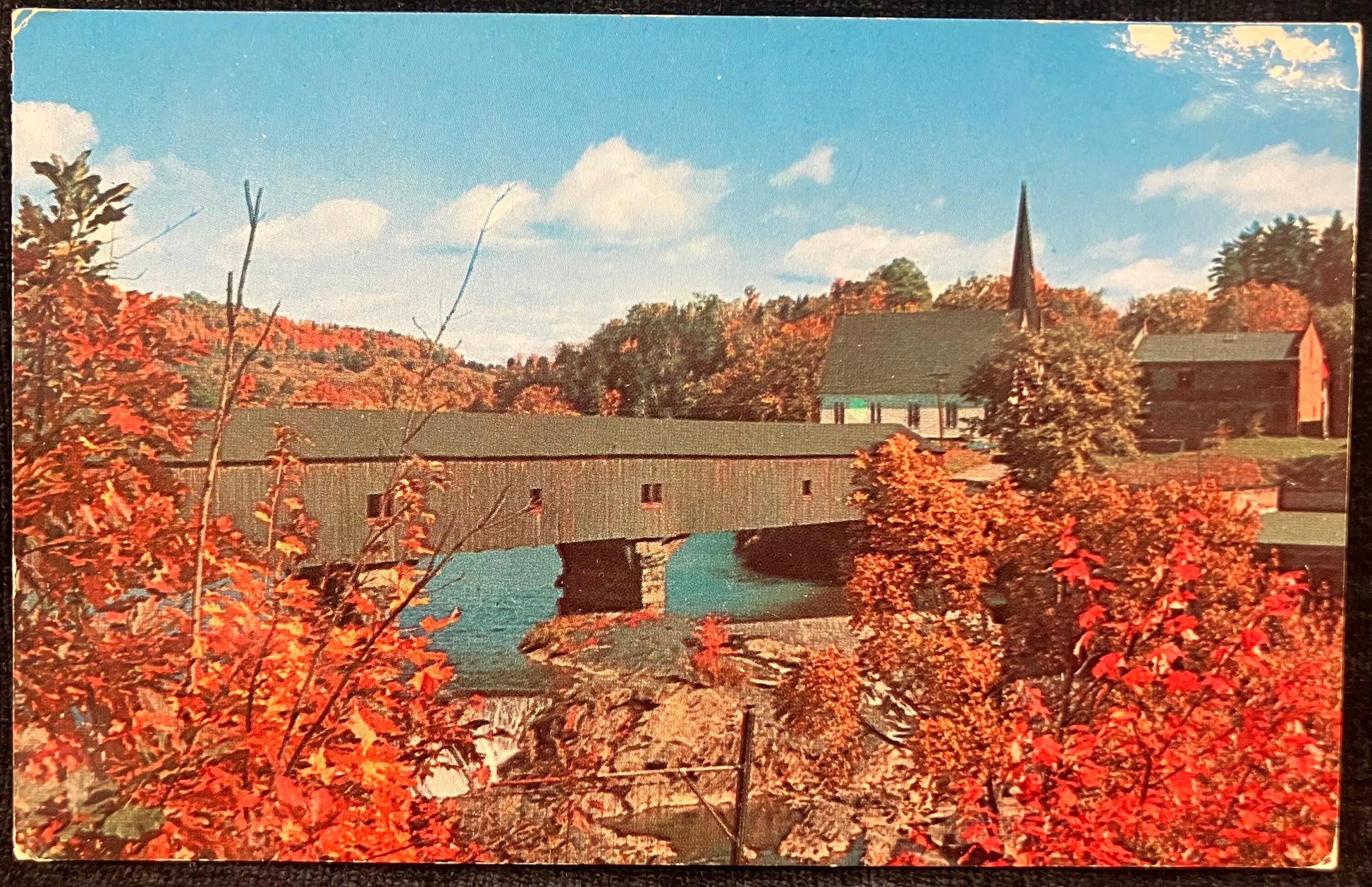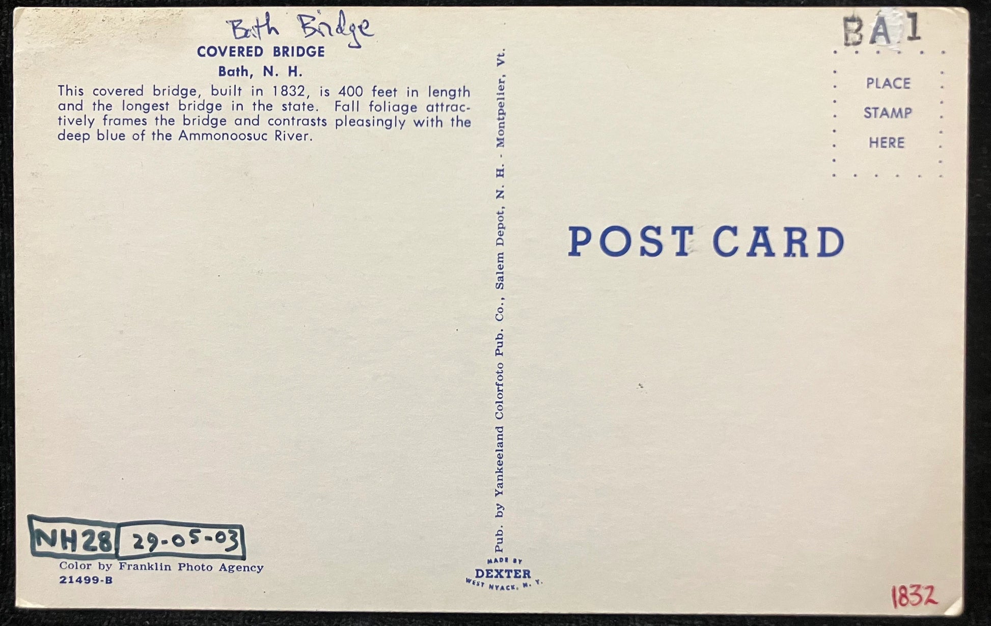 On back: COVERED BRIDGE Bath, N. H. This covered bridge, built in 1932, is 400 feet in length and the longest bridge in the state. Fall foliage attractively frames the bridge and contrasts pleasingly with the deep blue of the Ammonoosuc River.